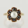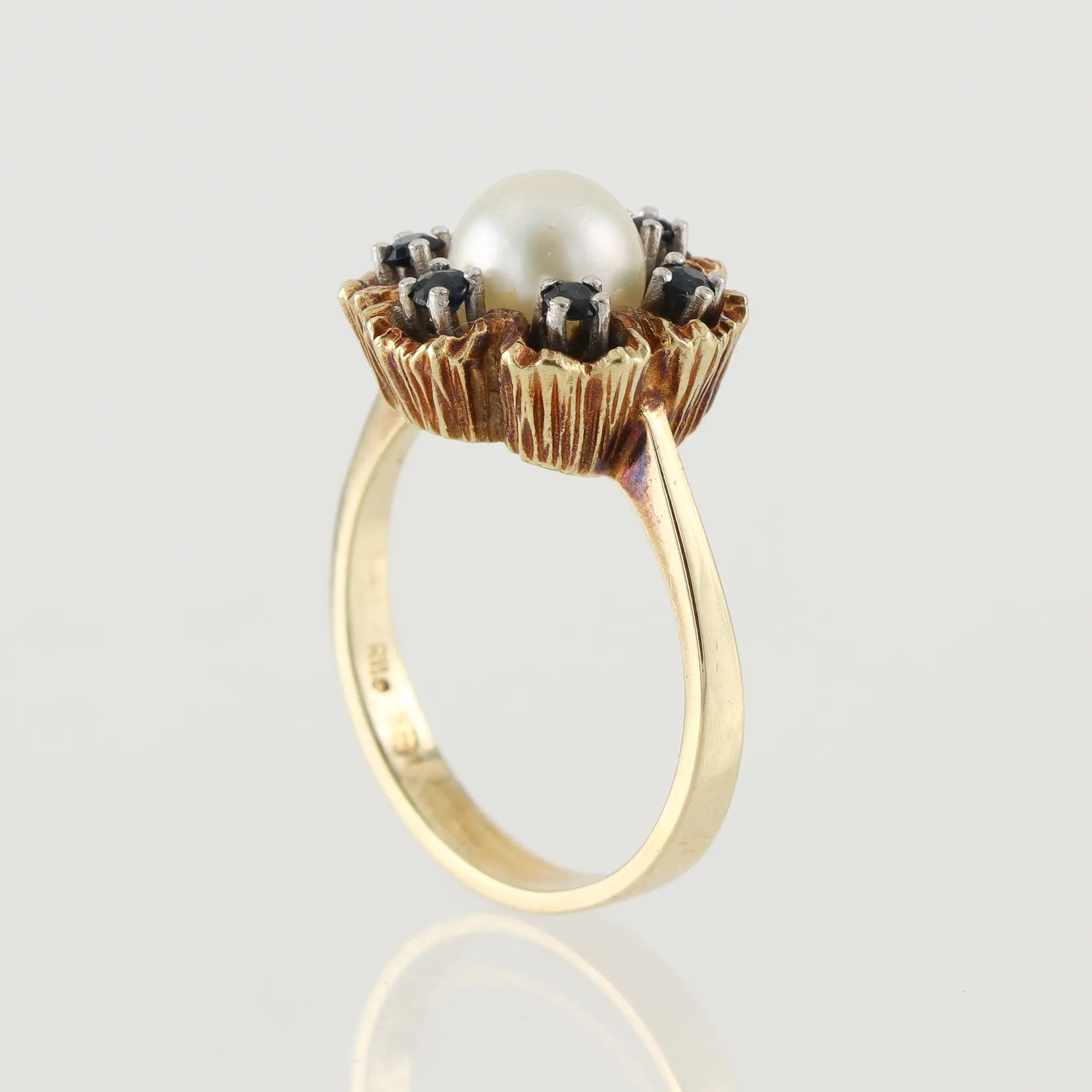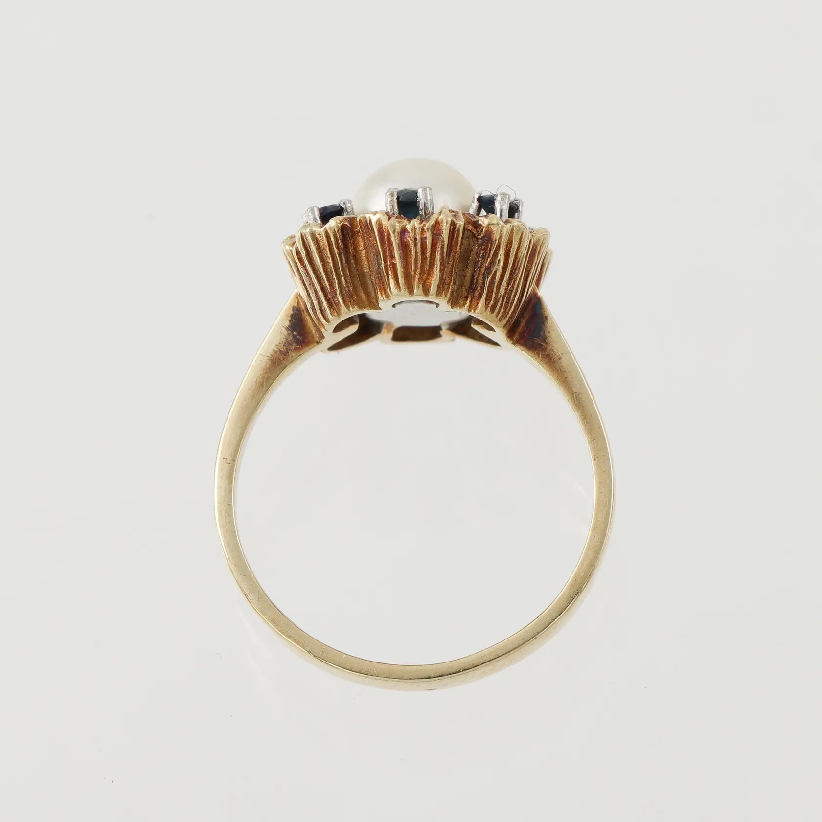 Ring med pärla och safirer, stämplad Rile, storlek 18 mm, bredd 2.9-14.4 mm, 14k. Vikt: 6,7 g.