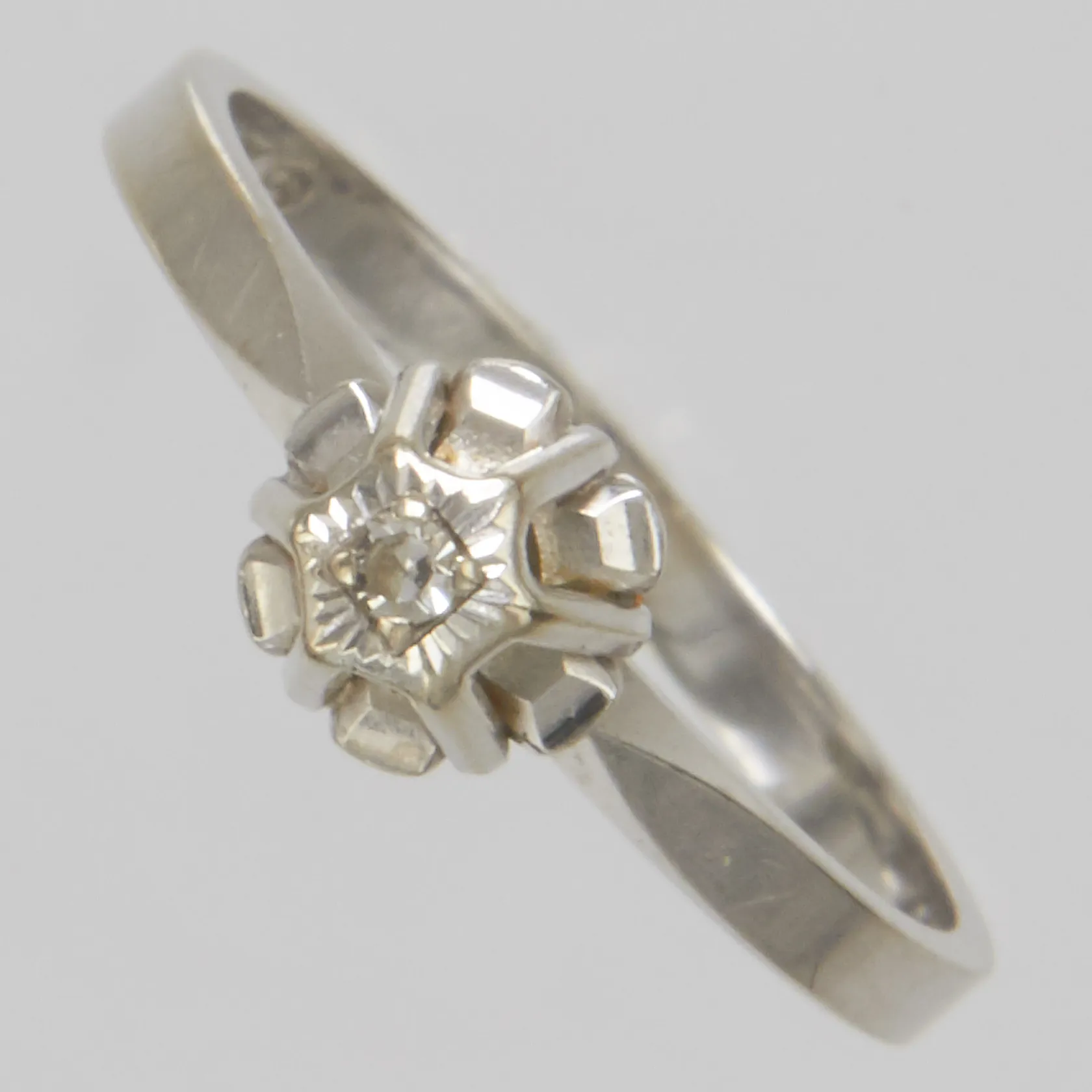 Ring, åttkantslipad diamant 1 x ca 0,01ct, stl 16, bredd 1,5-5,5mm, vitguld, 18K. Vikt: 1,7 g.