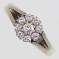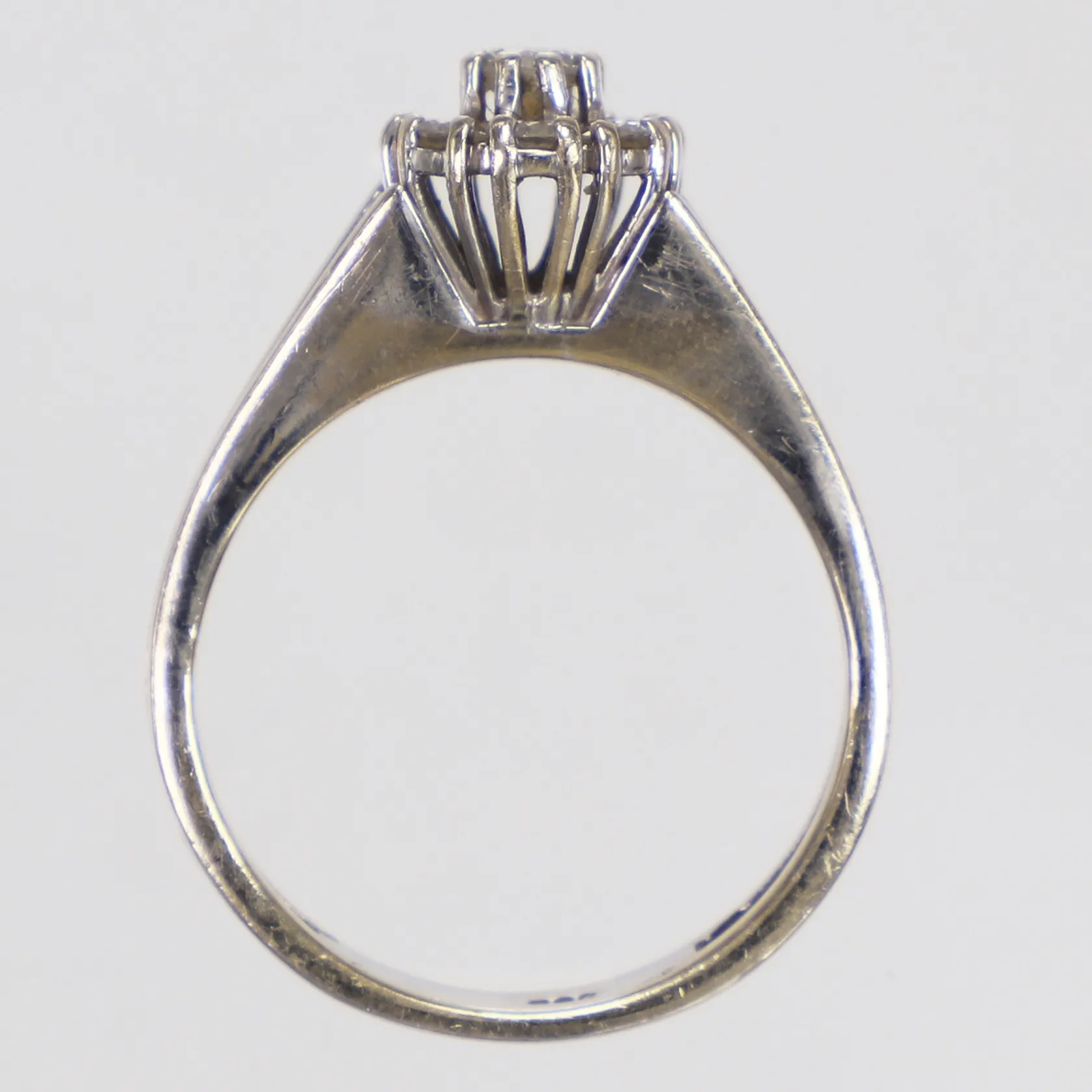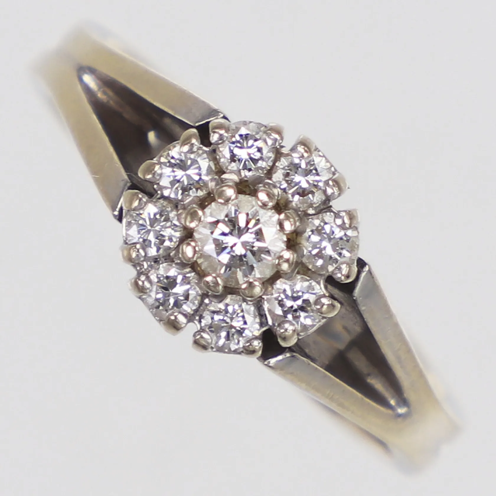 Ring diamanter 1 x ca0,12ct + 8 x ca0,03ct ca Cr/SI, stl 17¼, vitguld, sliten, 14K Vikt: 4,4 g.