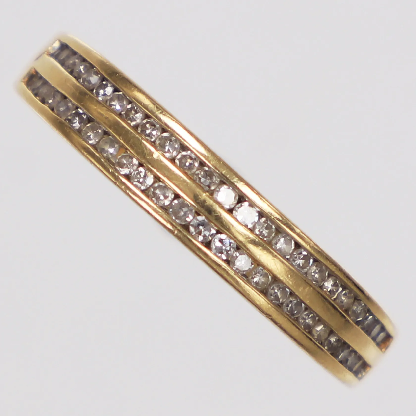 Ring diamanter 50 x ca0,005ct, stl 16¾, bredd 1,7-3,9mm, skev skena, 18K Vikt: 3 g.
