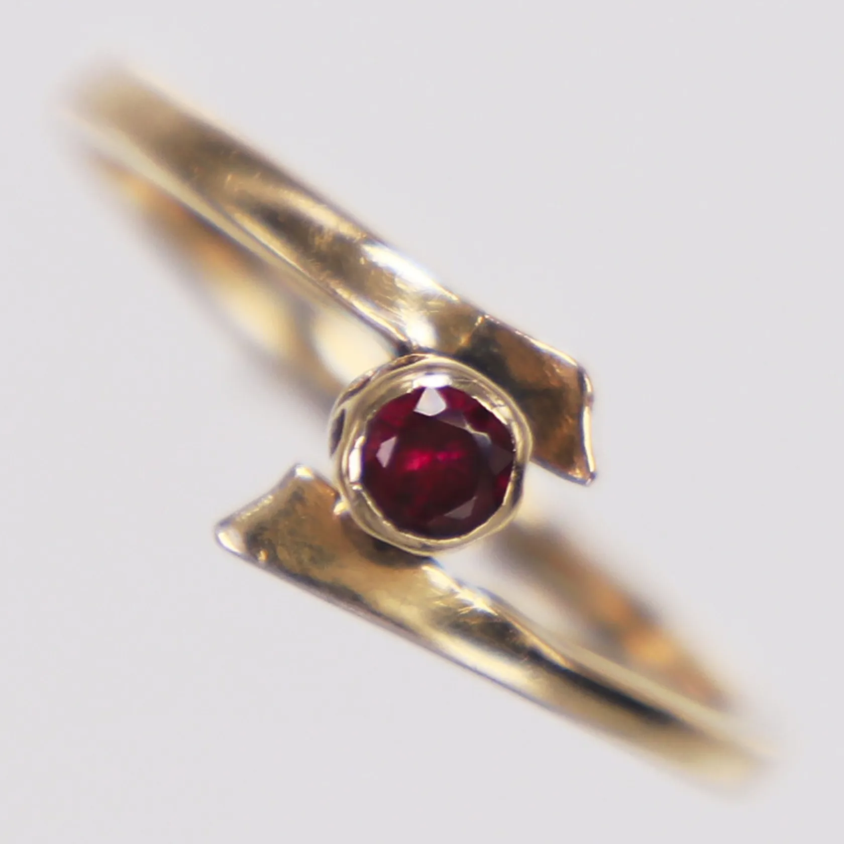 Ring röd sten, stl 17¾, bredd 1,7-6,8mm, 14K Vikt: 1,6 g.