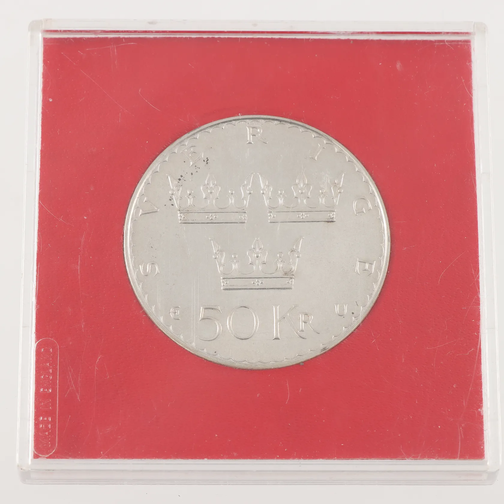 Minnesmynt 50kr 1975, Ø36mm, I Sverige utgår från folket all offentlig makt,plastetui, 925/1000 silver Vikt: 26,8 g.