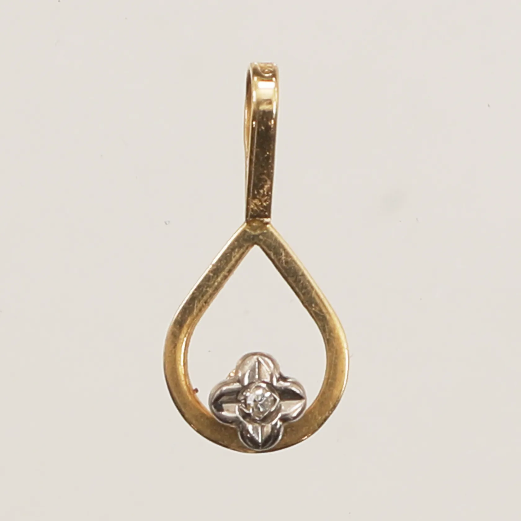 Hänge med diamant, ca 0,005ct 8/8-slipad, längd 15,7mm inklusive ögla, bredd 7,4mm, 18K Vikt: 0,5 g.