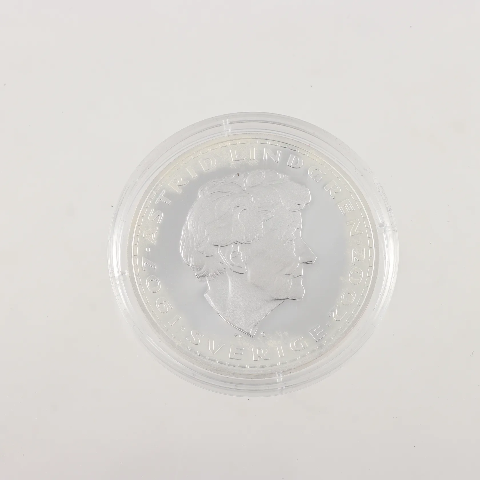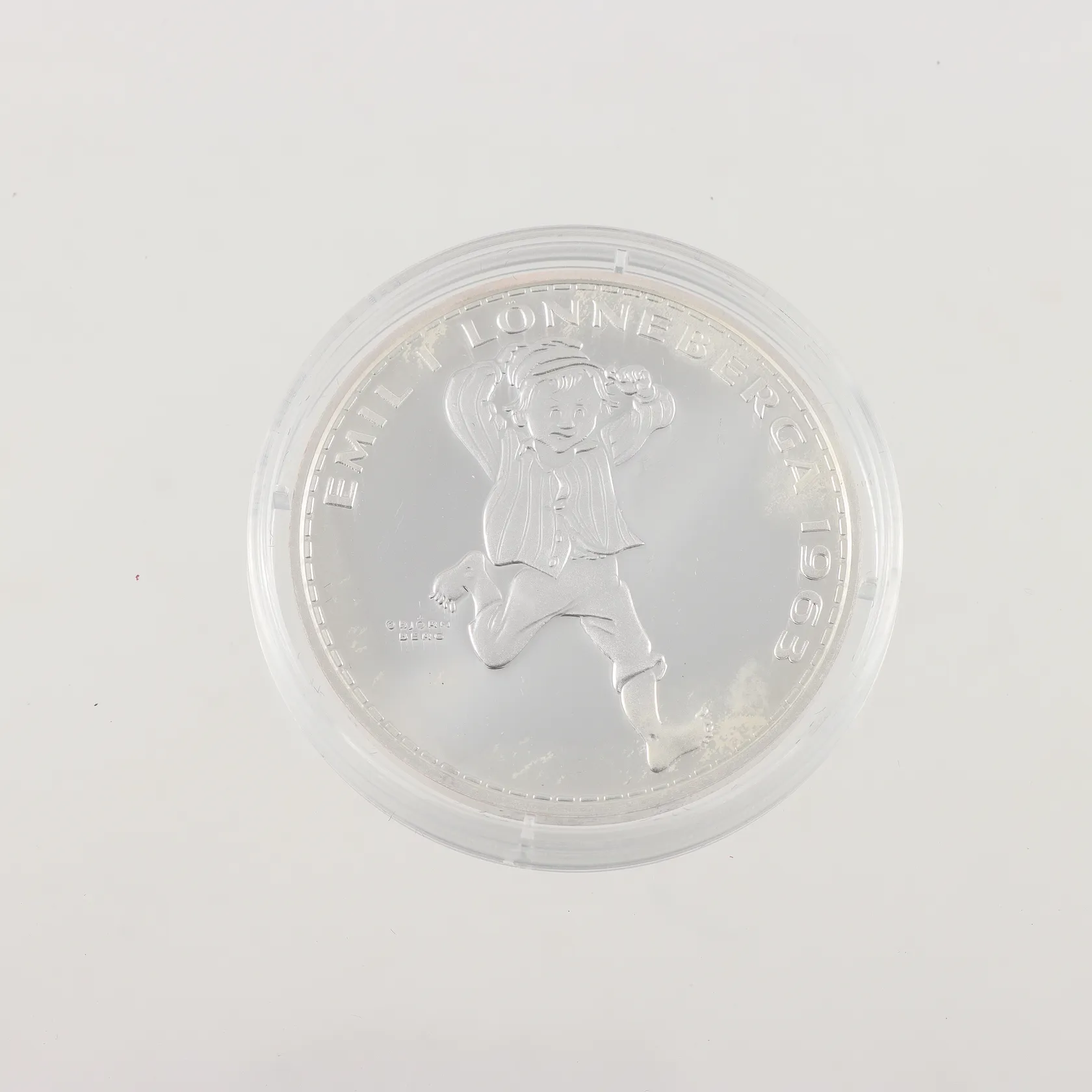 Samlarmynt Astrid Lindgren Emil i Lönneberga 1963, Ø38mm, plastetui, silver Vikt: 26,6 g.