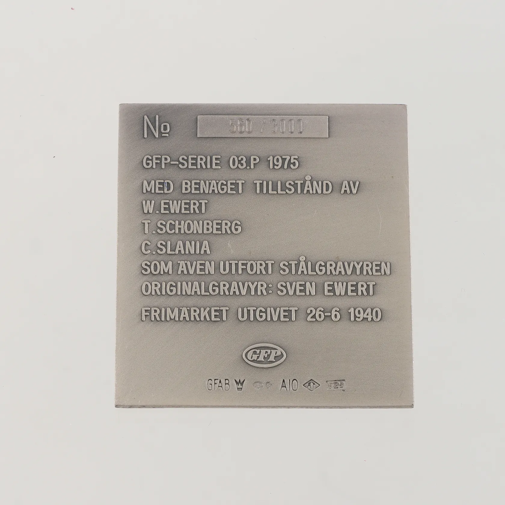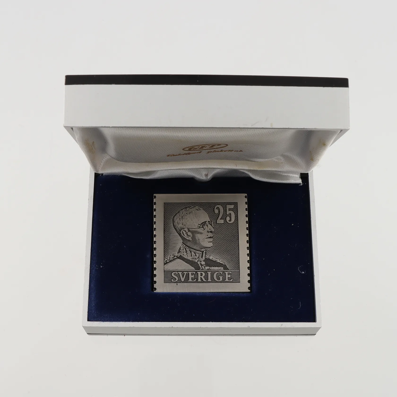 Frimärksplakett Silver Gustaf V nr:560/3000, mått 34,5x37,1mm, etui, silver Vikt: 20,5 g.