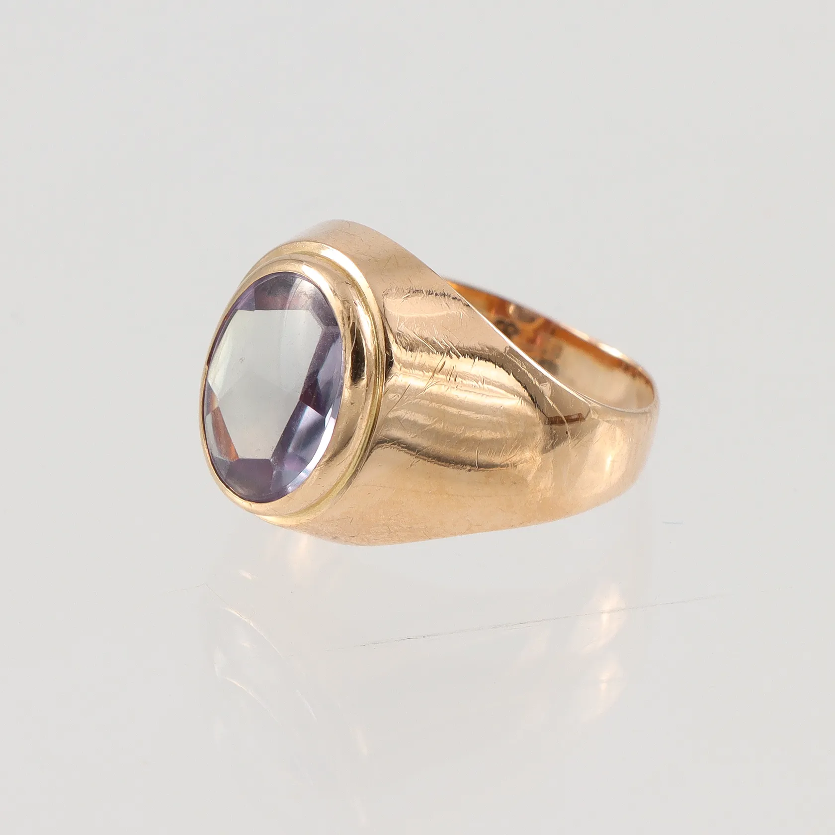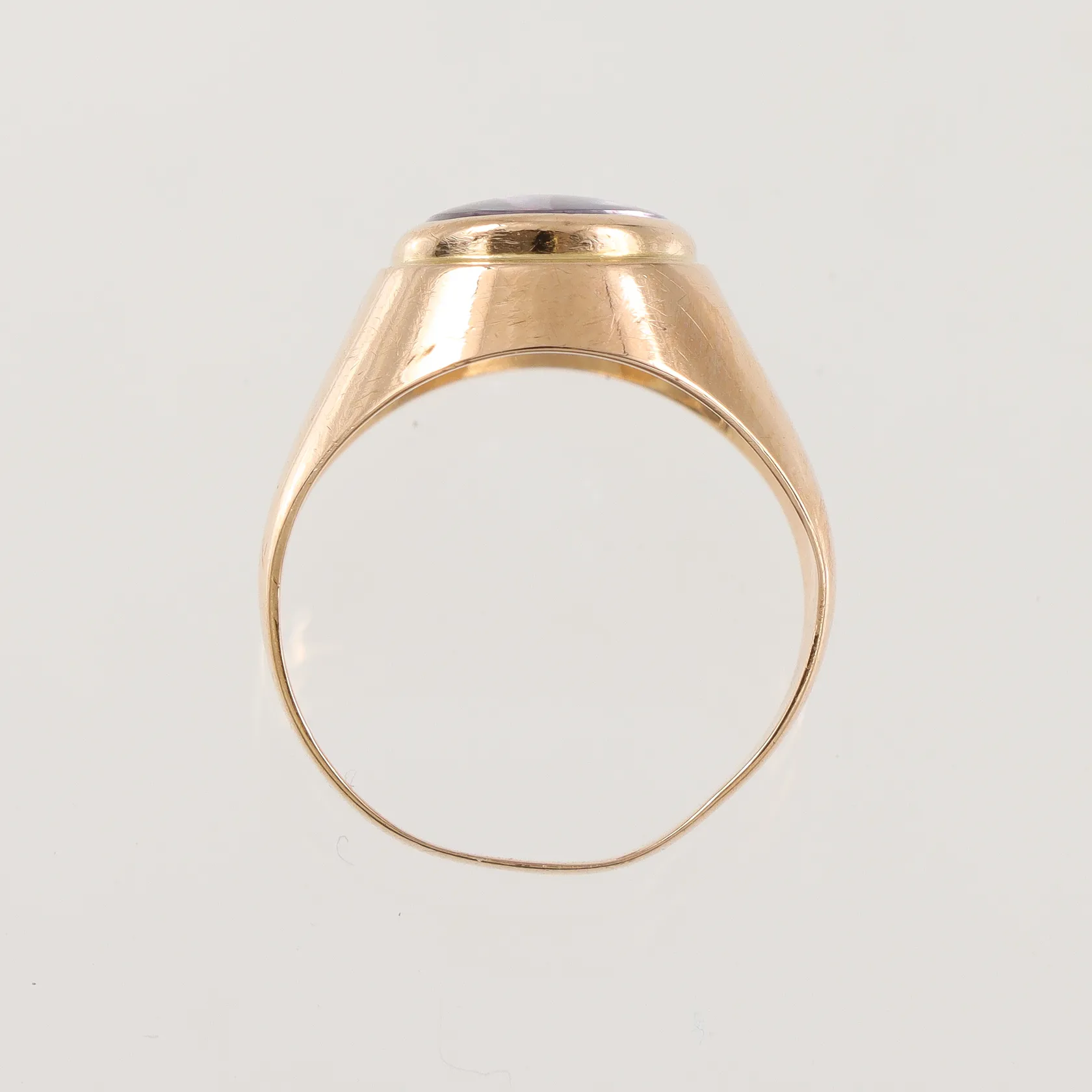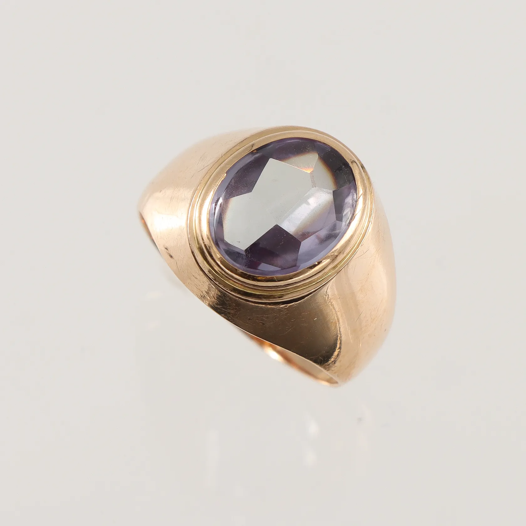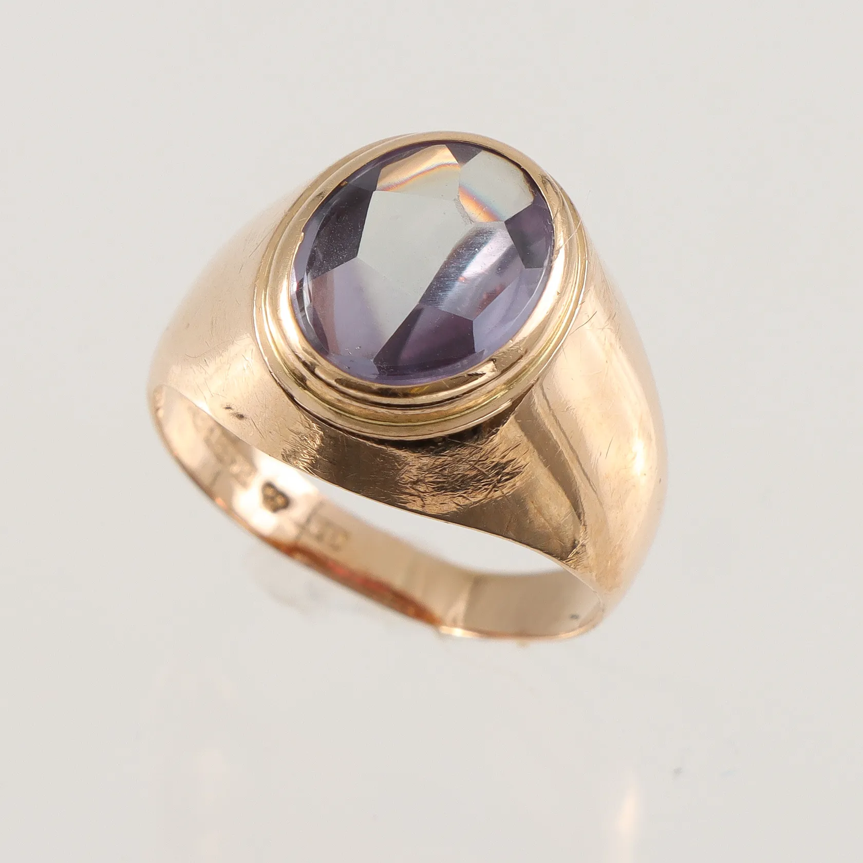Ring med lila sten 18k, stl 15¼mm något ojämn form Vikt: 2,9 g.