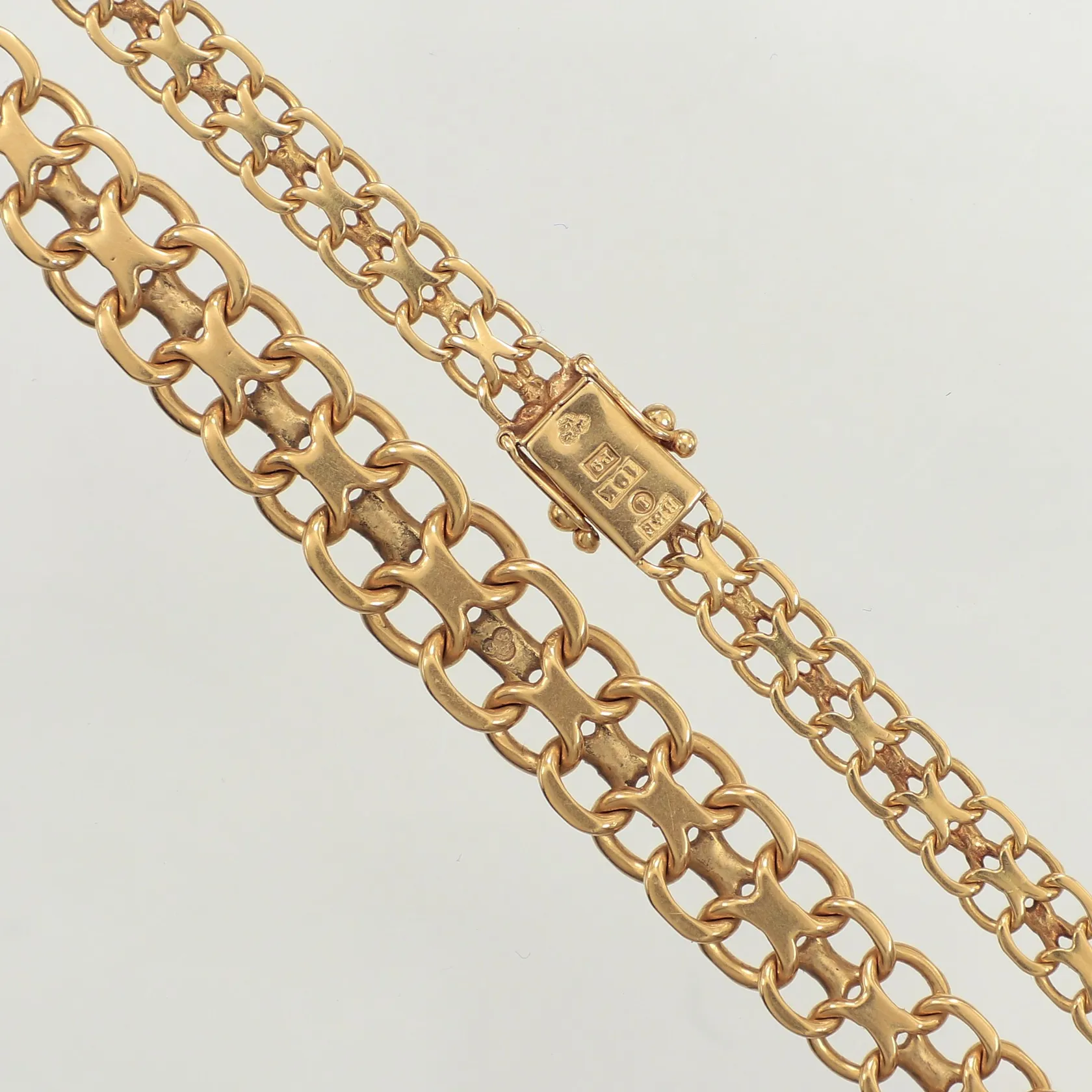 Collier doserad X-länk, längd 45cm, bredd 5,7-10mm, Stockholm 1985, 18K Vikt: 28,9 g.
