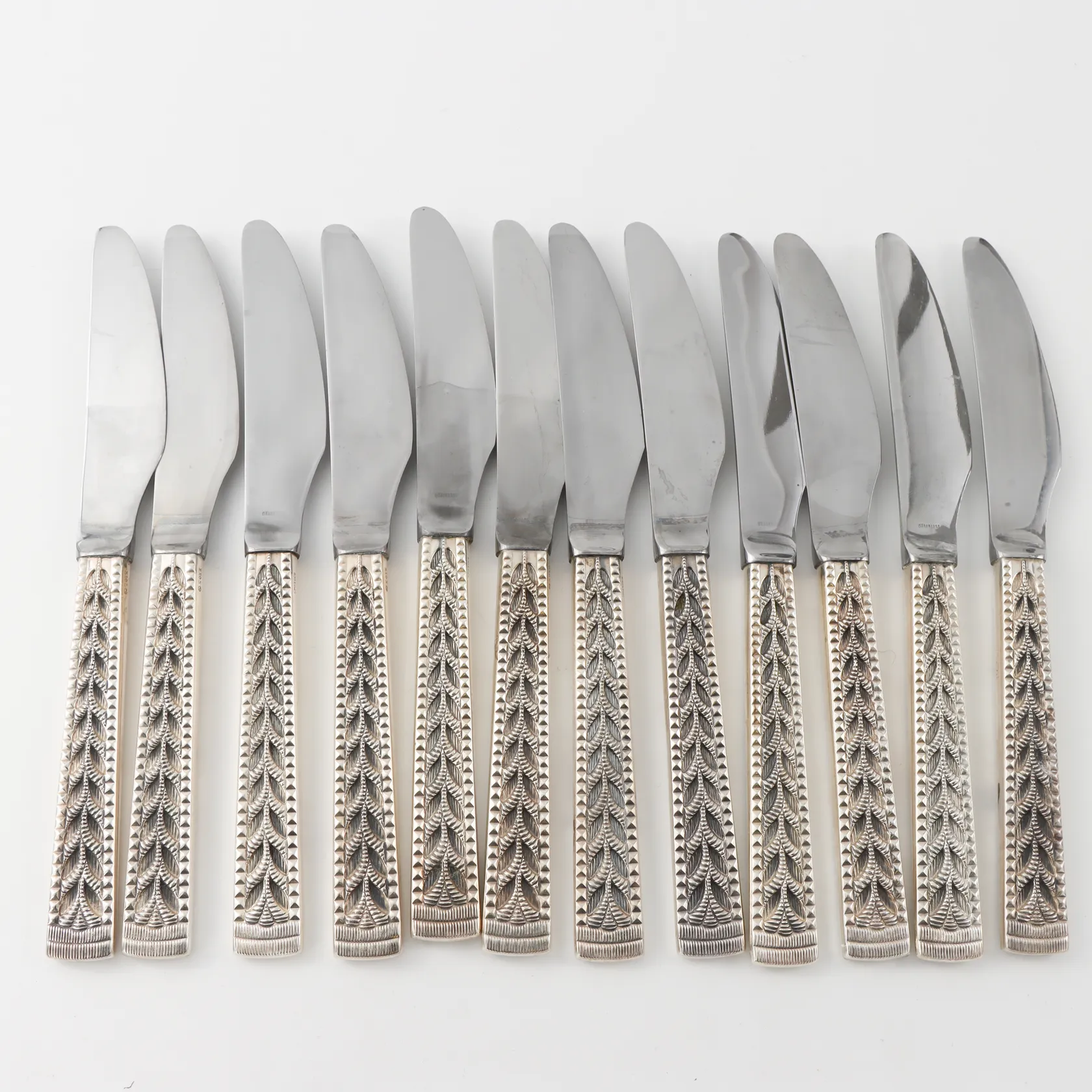 Bordsknivar 12st, längd ca 20 cm, modell Juvel, Norge, silver med fyllda skaft och rosfria missfärgade blad Vikt: 890 g.