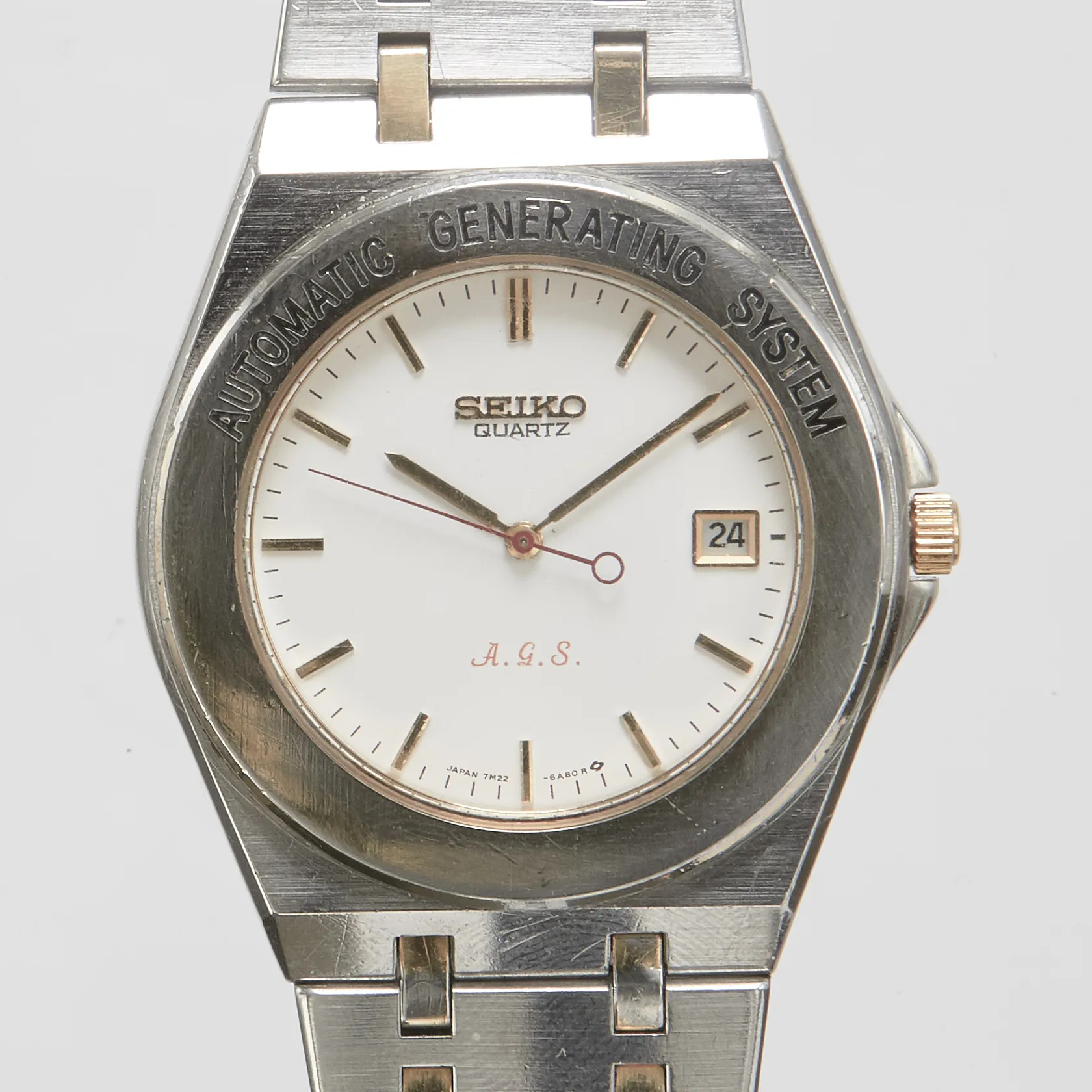 Herrur Seiko A.G.S, stål, quartz, 38mm, boettnr: 7M22-6A60, snr: 8N0178, datum, kort stållänk, viklås,