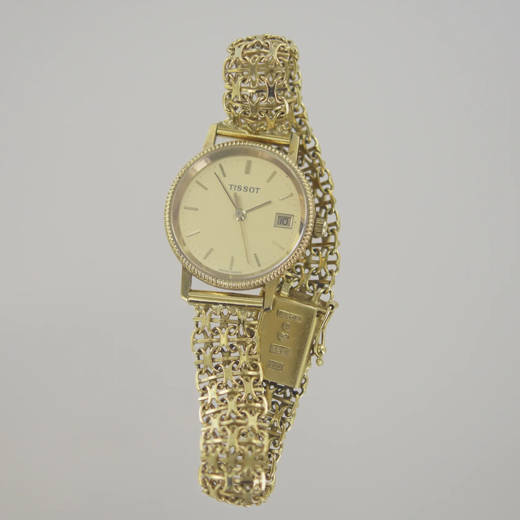 Damur Tissot armband X-länk med stavar, längd 17,5 cm, bredd 1 cm, diam 24 mm, 18K, bv 24,5 gr. Nytt batteri behövs Vikt: 24,5 g.