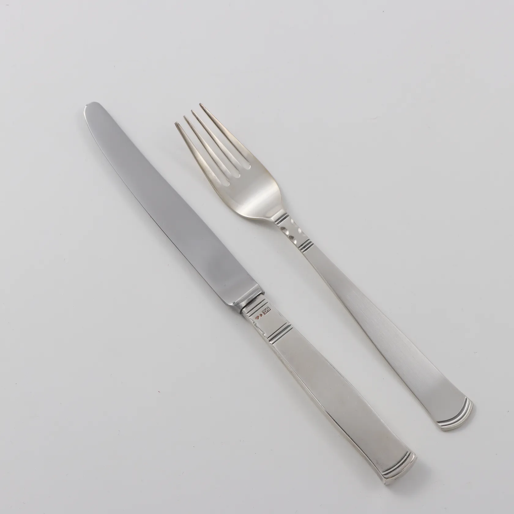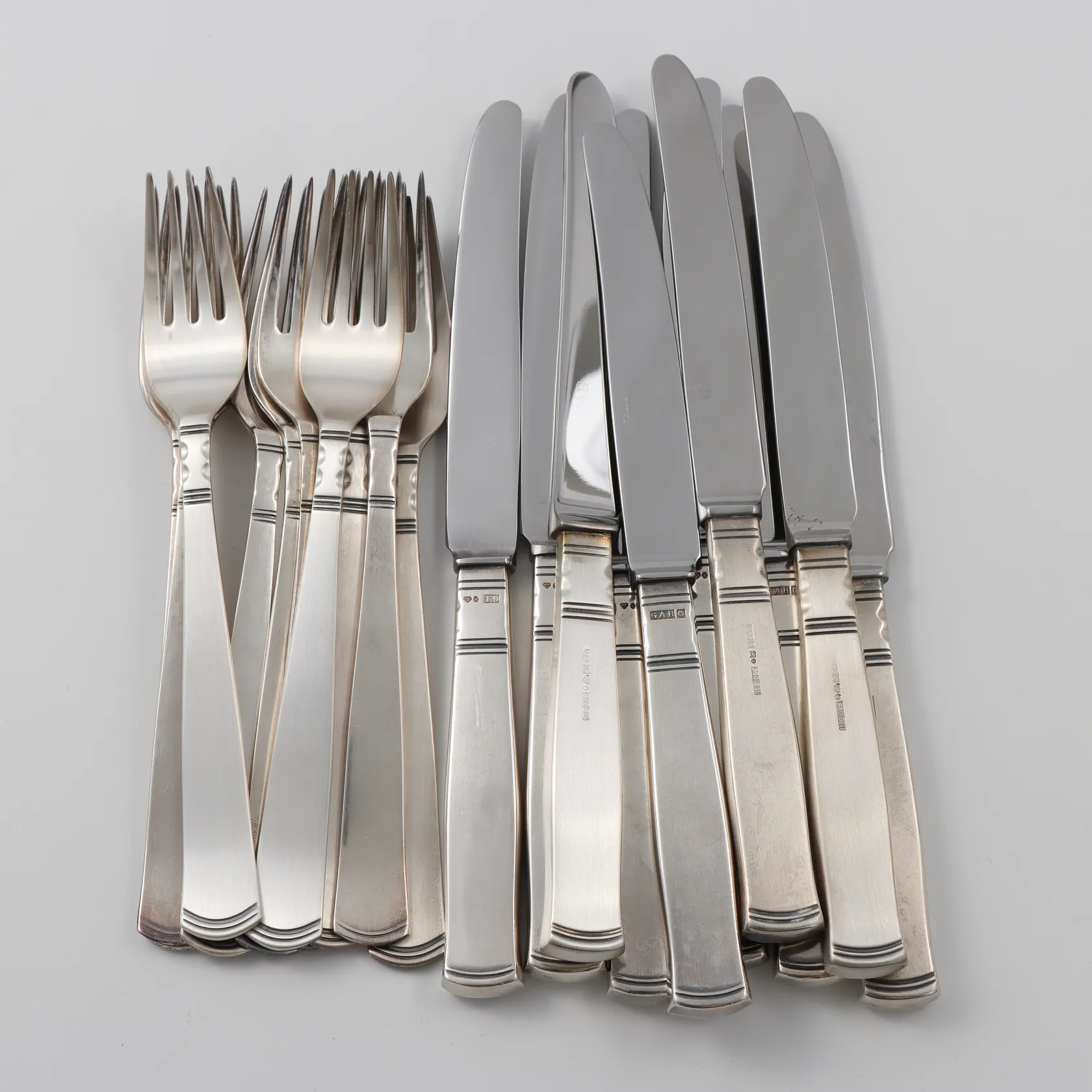 Smörgåsbestick modell Rosenholm, Gafflar 10st längd 13,7cm vikt 196gram och knivar 10st längd 16,7cm rostfritt blad och fyllda skaft vikt 425gram, silver