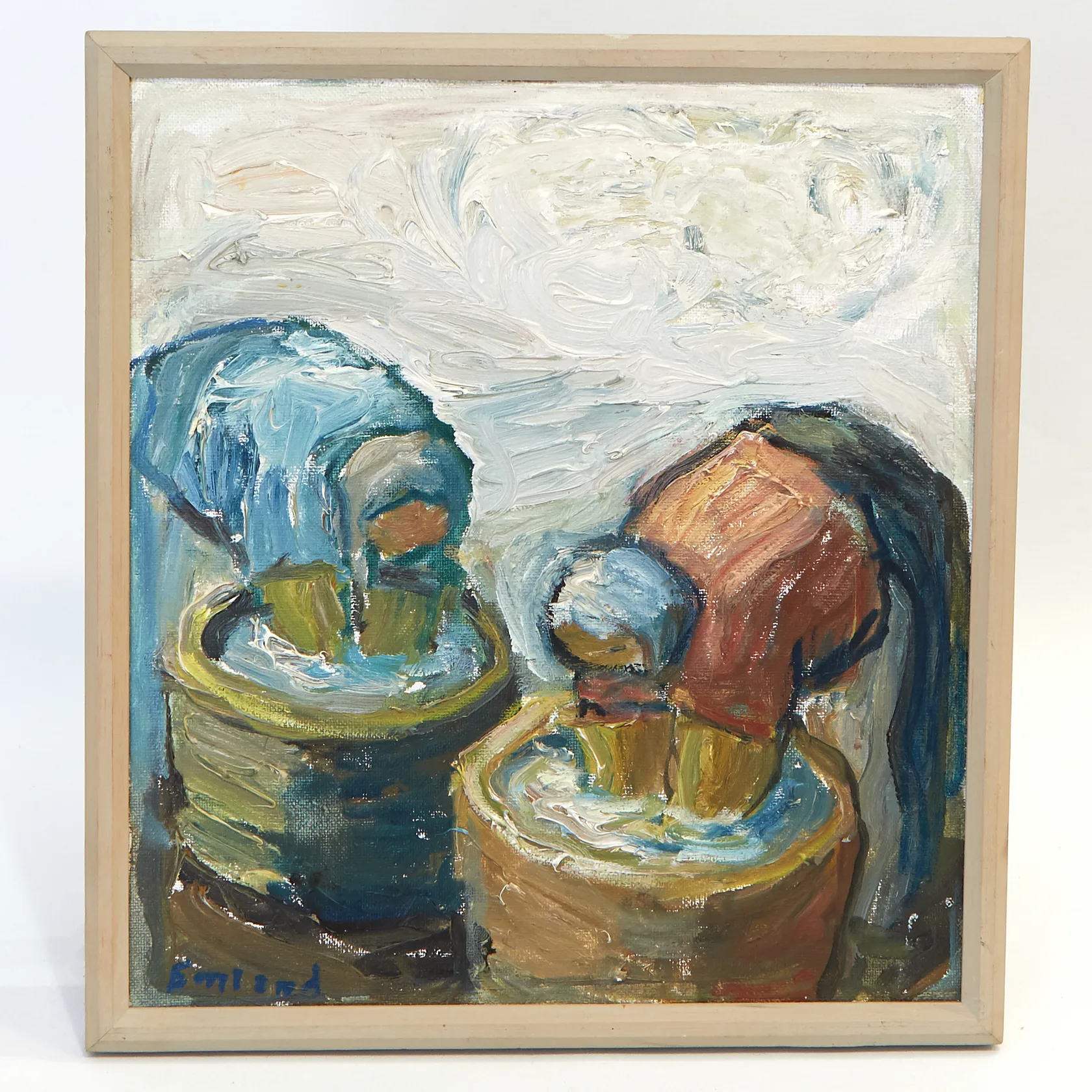 Tavla olja på pannå "tvätterskor" signerad Einar Emland, rammått 30x33,5cm