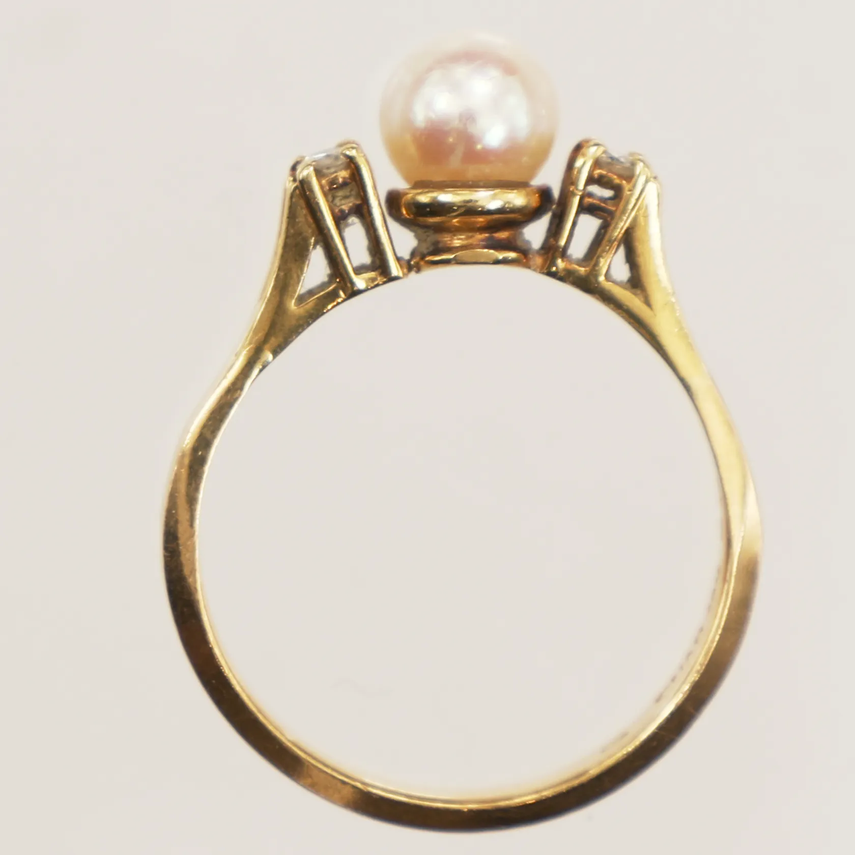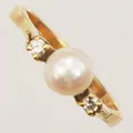 Ring med pärla och diamanter, 2x ca 0,03ct, stl 18¾, bredd 2,8-6,3mm, pärla skevt infattad, 18K Vikt: 3,8 g.