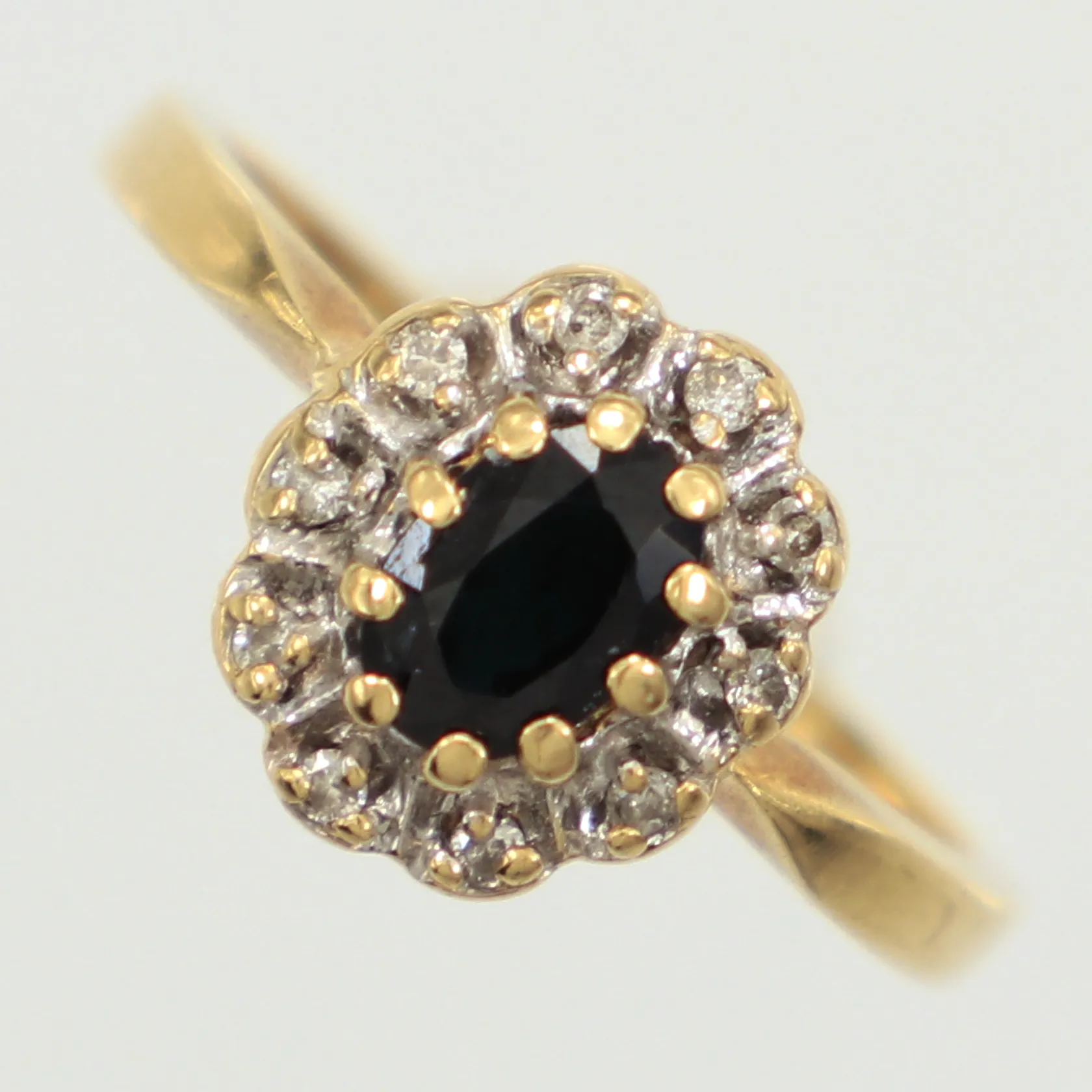 Carmosé ring, diamanter 10x ca 0,005ct, blå sten möjligen safir, stl 16½, bredd 10,4mm, 18K Vikt: 3,3 g.