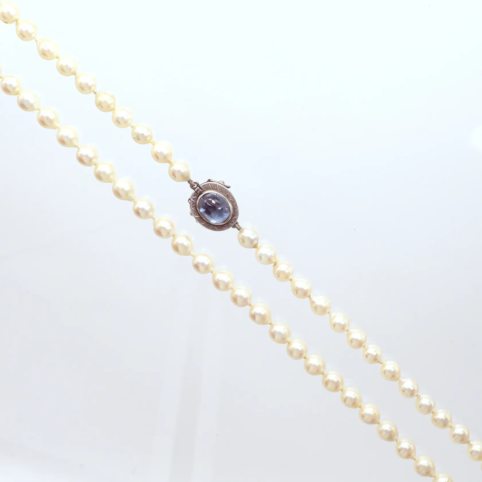 Pärlcollier barocka Ø7mm längd 70cm silverlås 830/1000 blå sten Hallbergs Guldsmeds Ab år 1995 behöver träs om