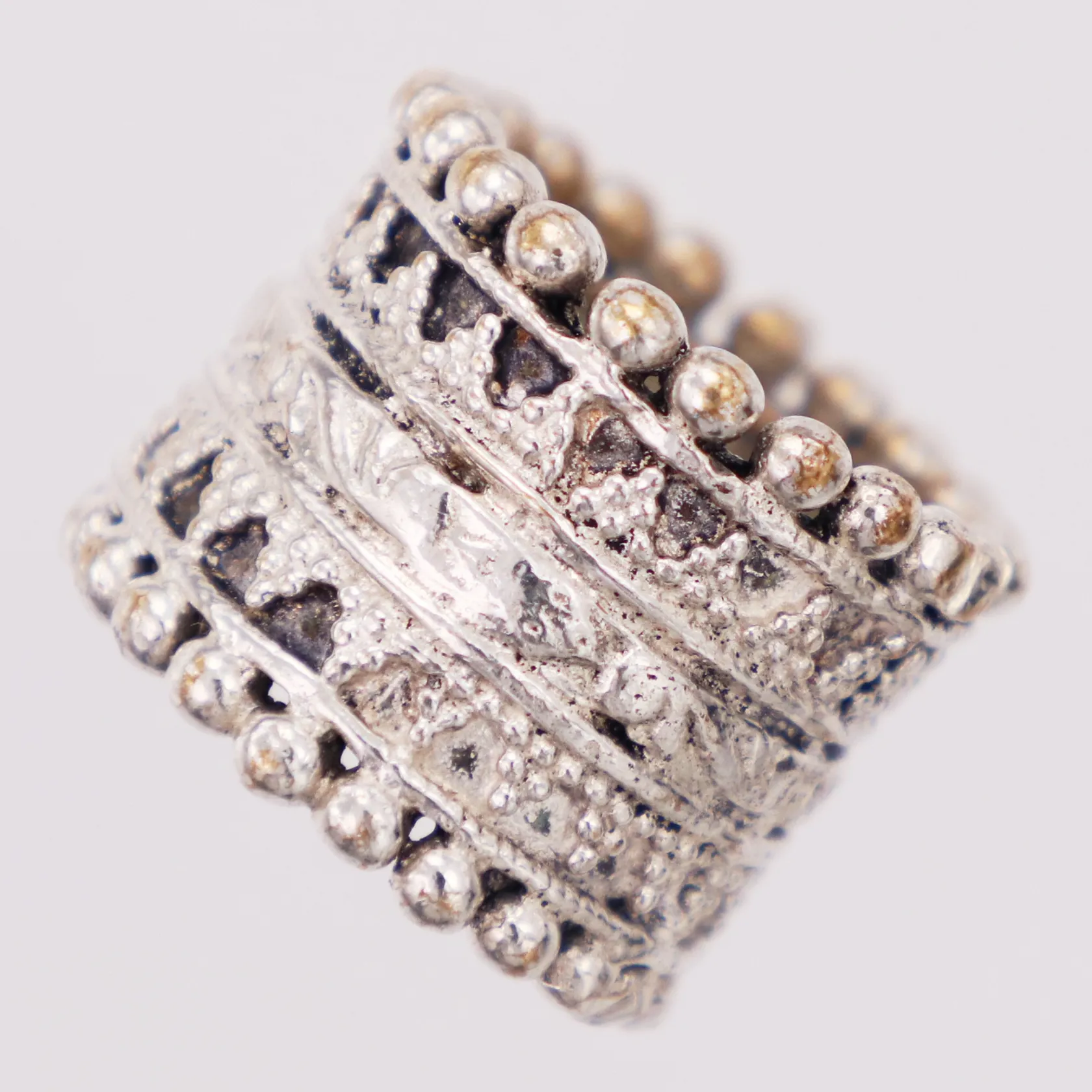 Ring mönstrad, stl 15¾, bredd 18mm, saknar stämplar, silver Vikt: 13,4 g.