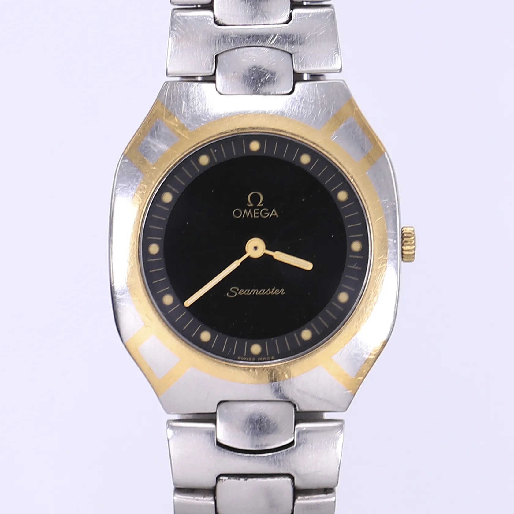 Herrur Omega Seamaster Polaris quartz, Ø32mm, stål med gulddetaljer, integrerad länk i stål, inga tillbehör, repig