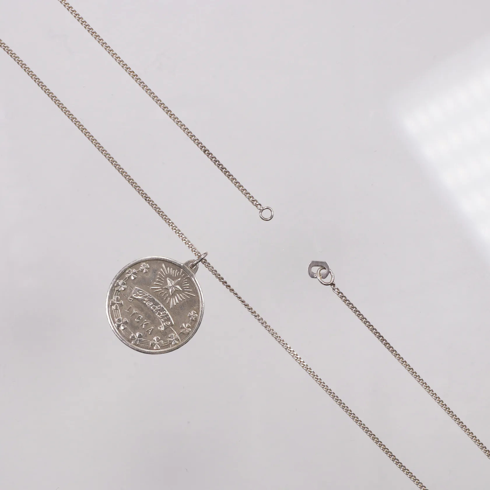 Collier hänge lycka, ca 37cm, gravyr, defekt saknar lås, 835/1000 silver Vikt: 7,4 g.
