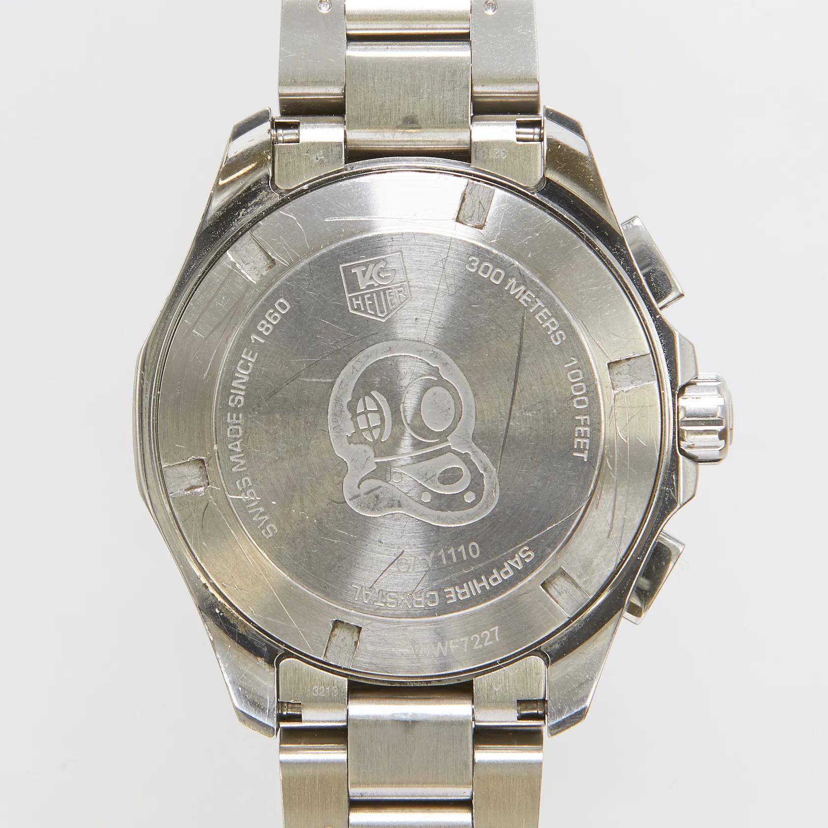 Herrur Tag Heuer Aquaracer Chronograph, stål, automatisk, 43mm, refnr CAY1110.BA0927, snr WWF7227, safirglas, datum, kronograf, stållänk, viklås, extra länkbitar, garantikort 2020, tydliga repor på länk samt boett, skruv saknas invändigt, inga övriga tillbehör.