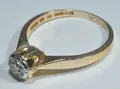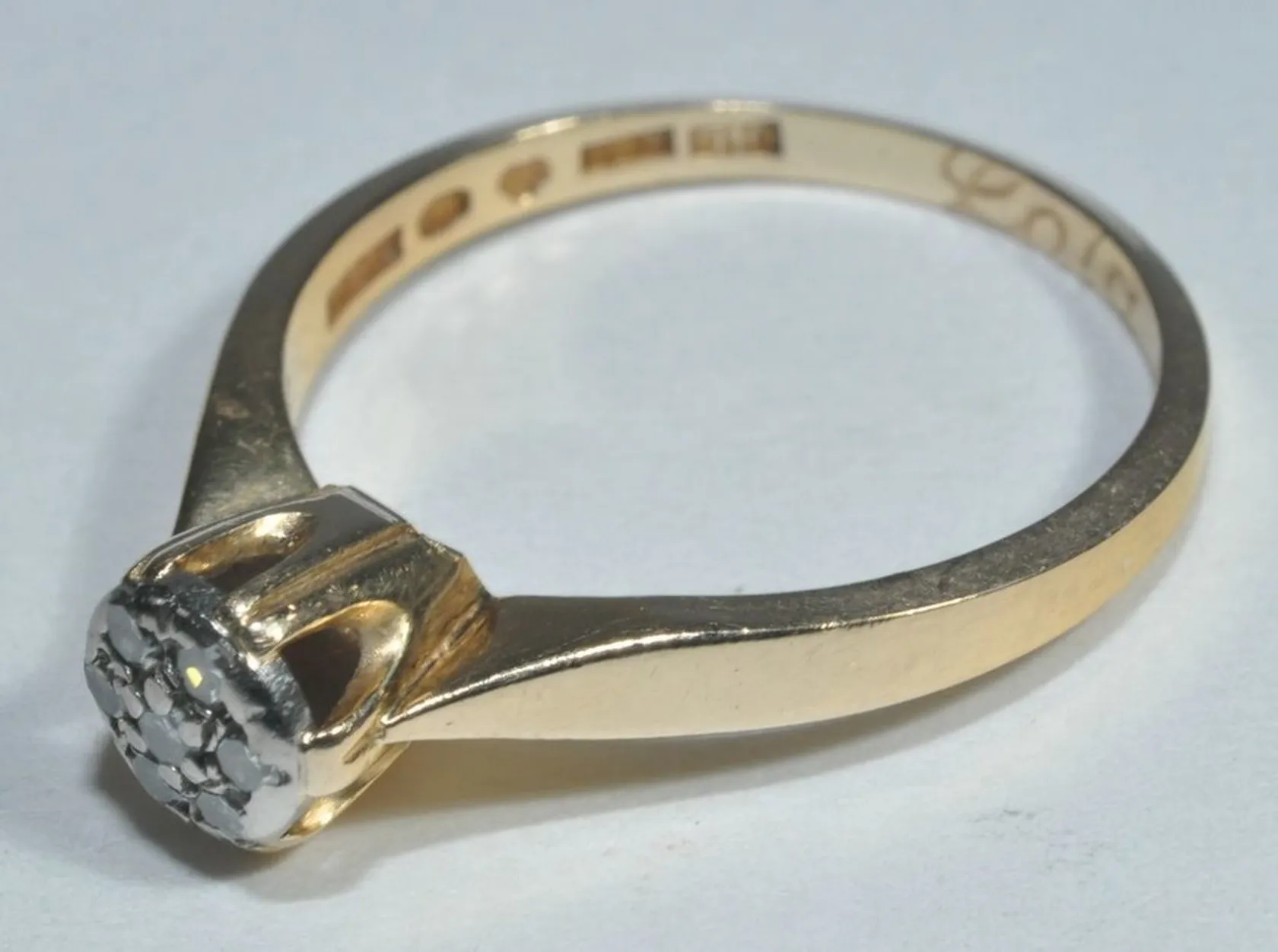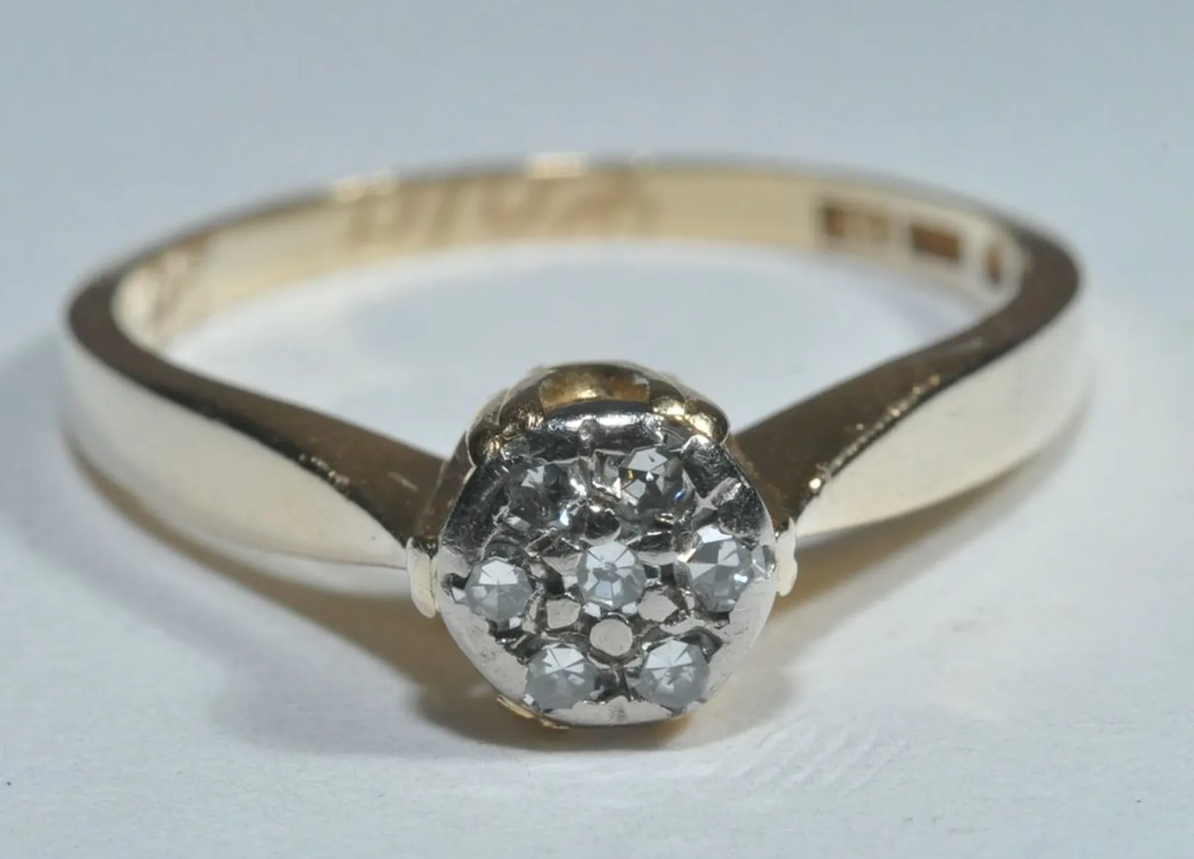 Ring med 7 diamanter 0,12ct totalt, Ø 18 mm Bredd 2-6 mm 18k, graverad Vikt: 3,2 g.