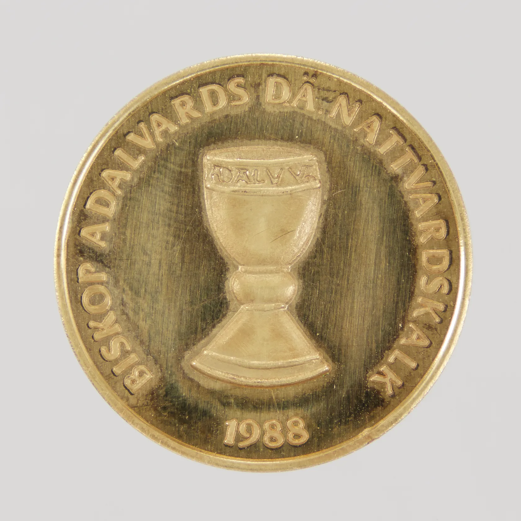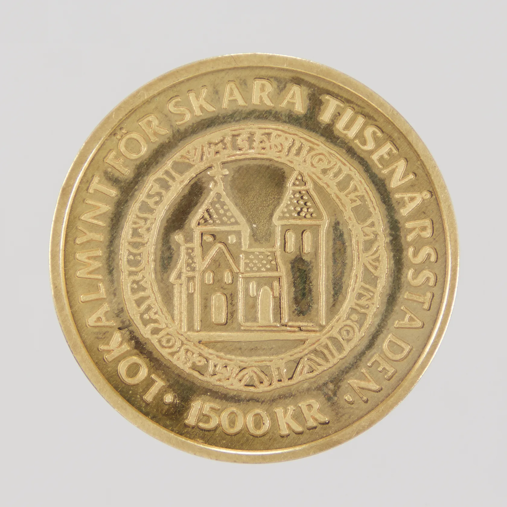 Minnesmynt, Ø 27mm, Lokalmynt för Skara tusenårsstaden 1500 kr, Biskop Adalvards Dä.Nattvardskalk 1988, SCAB Nya Scandcraft Ab Trelleborg 1988, 18K Vikt: 10 g.