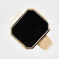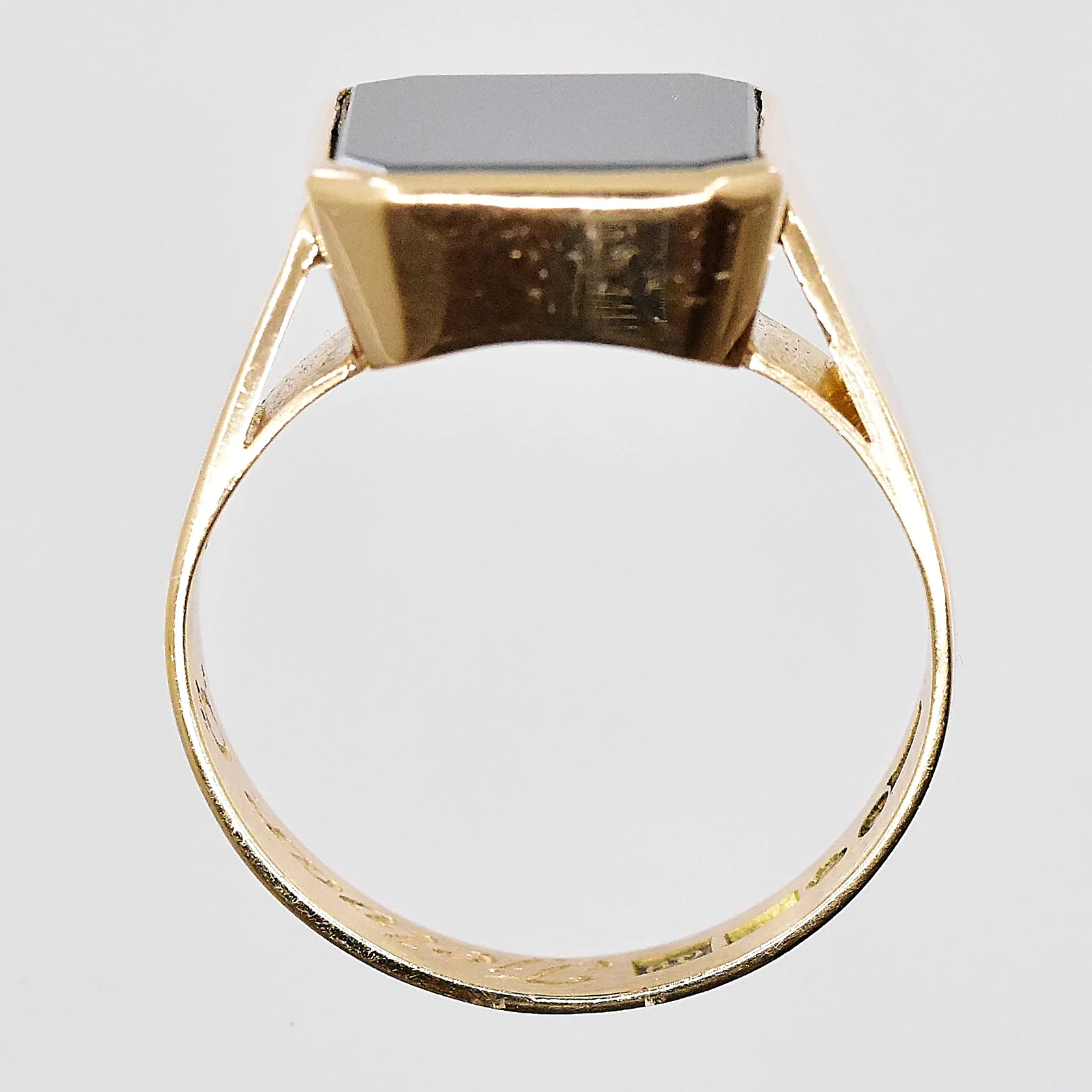 Klackring hematit stl 19¼, ovandel bredd 14,6mm, personligt graverad, 18K Vikt: 8,3 g.