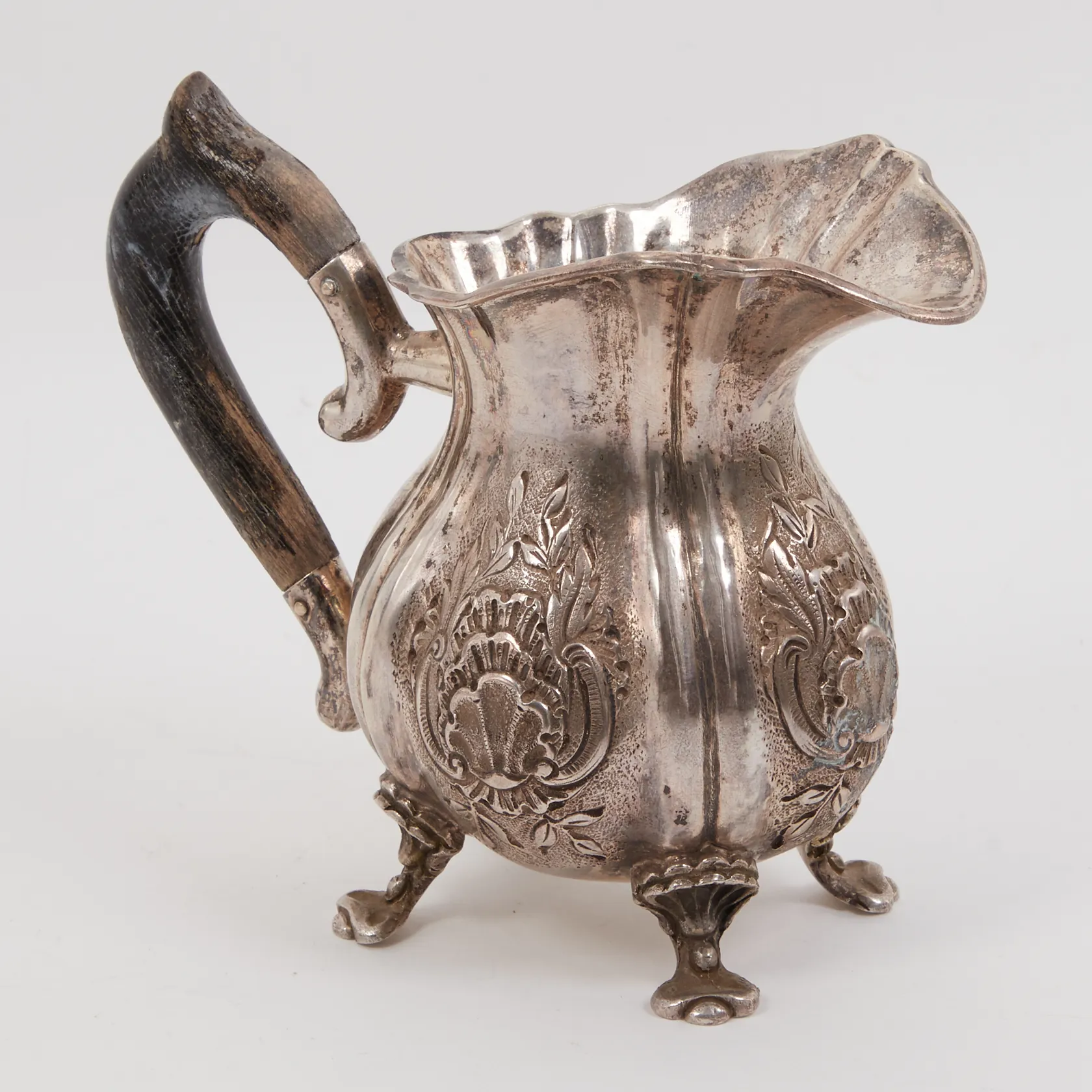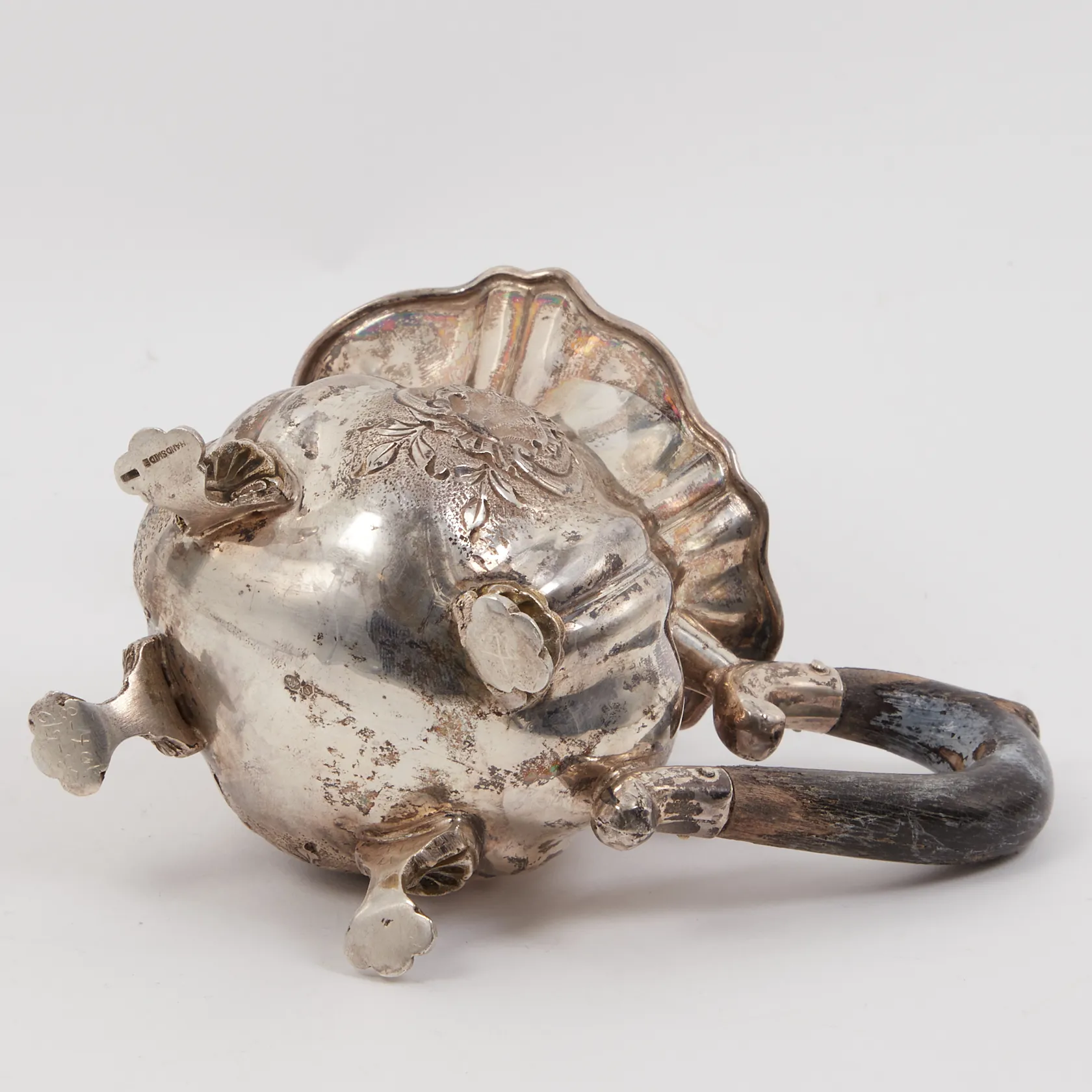 Gräddkanna på fötter med trähandtag, höjd 8,5cm, bredd ca 10,5cm, handsmide Silver 830/1000 Vikt: 112 g.
