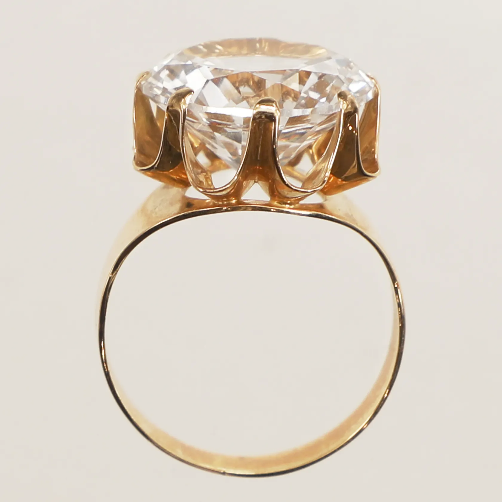 Ring med vit syntetisk spinel, stl 17¾, bredd 15,3mm, 18K Vikt: 5,2 g.