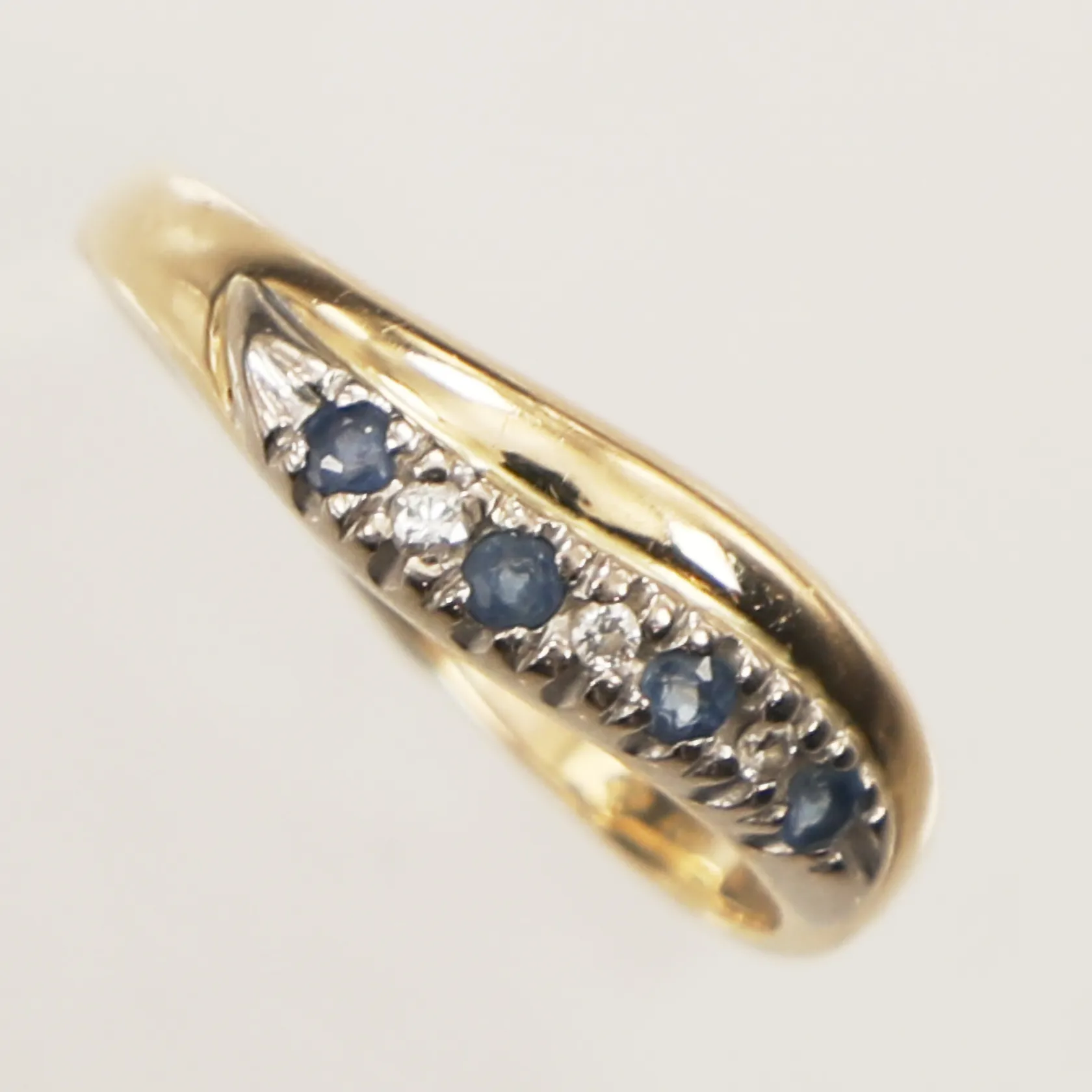 Ring med blå stenar, troligen safir och diamanter 3x ca 0,01ct, stl 17¾, bredd 1,5-5mm, stenar med nagg, 18K Vikt: 2,1 g.