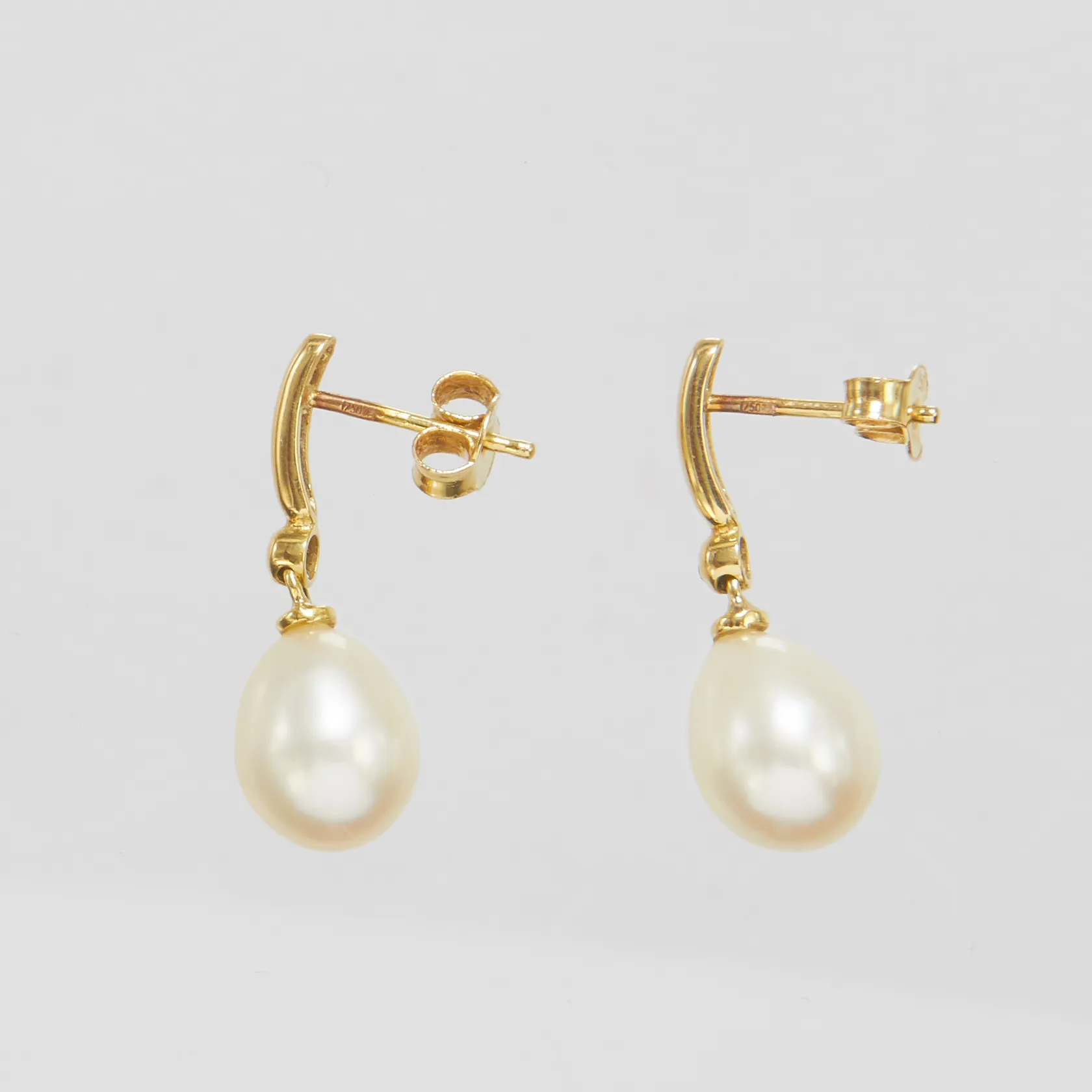 Ett par örhängen, odlade sötvattenpärlor, diamanter 2 x ca 0,005ct, längd ca 22mm, bredd 2,5-8,5mm, 18K, bruttovikt: 3,7g. Vikt: 3,7 g.