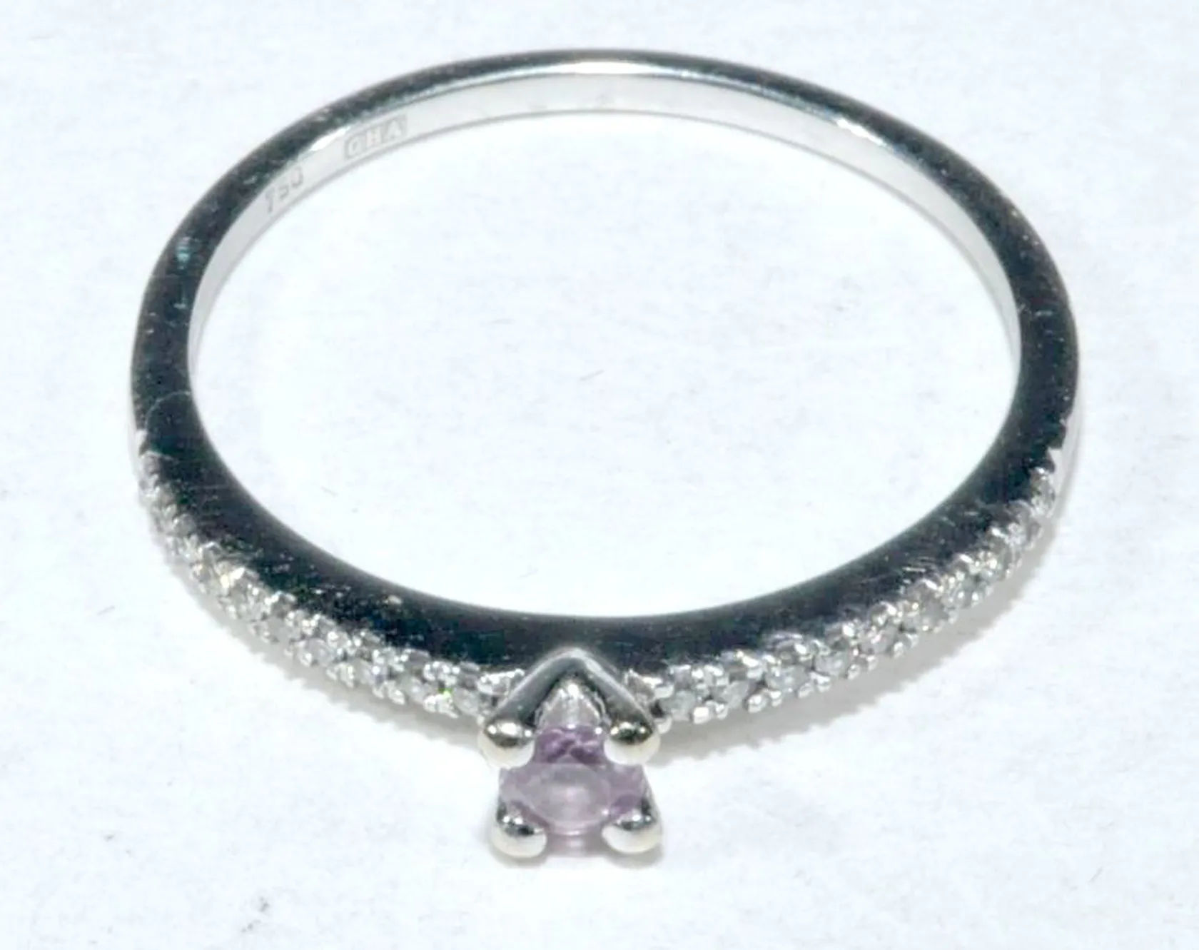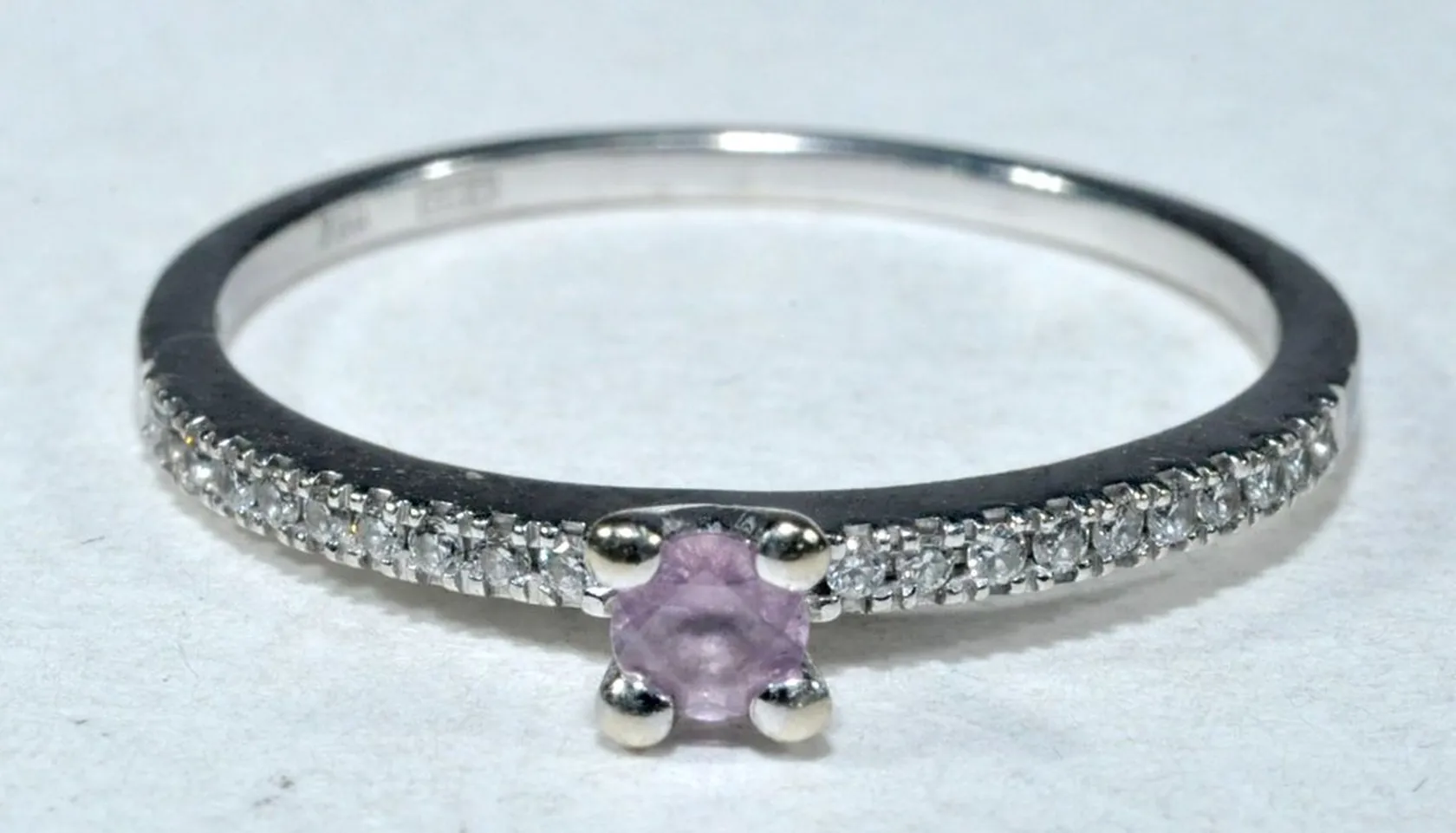 Ring med 20 diamanter 0,090ct WSI 1 rosasafir 18k 1,9 gr Ø17,5 mm bredd 1-3 mm höjd5 mm Ny pris6000:- Vikt: 1,9 g.