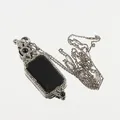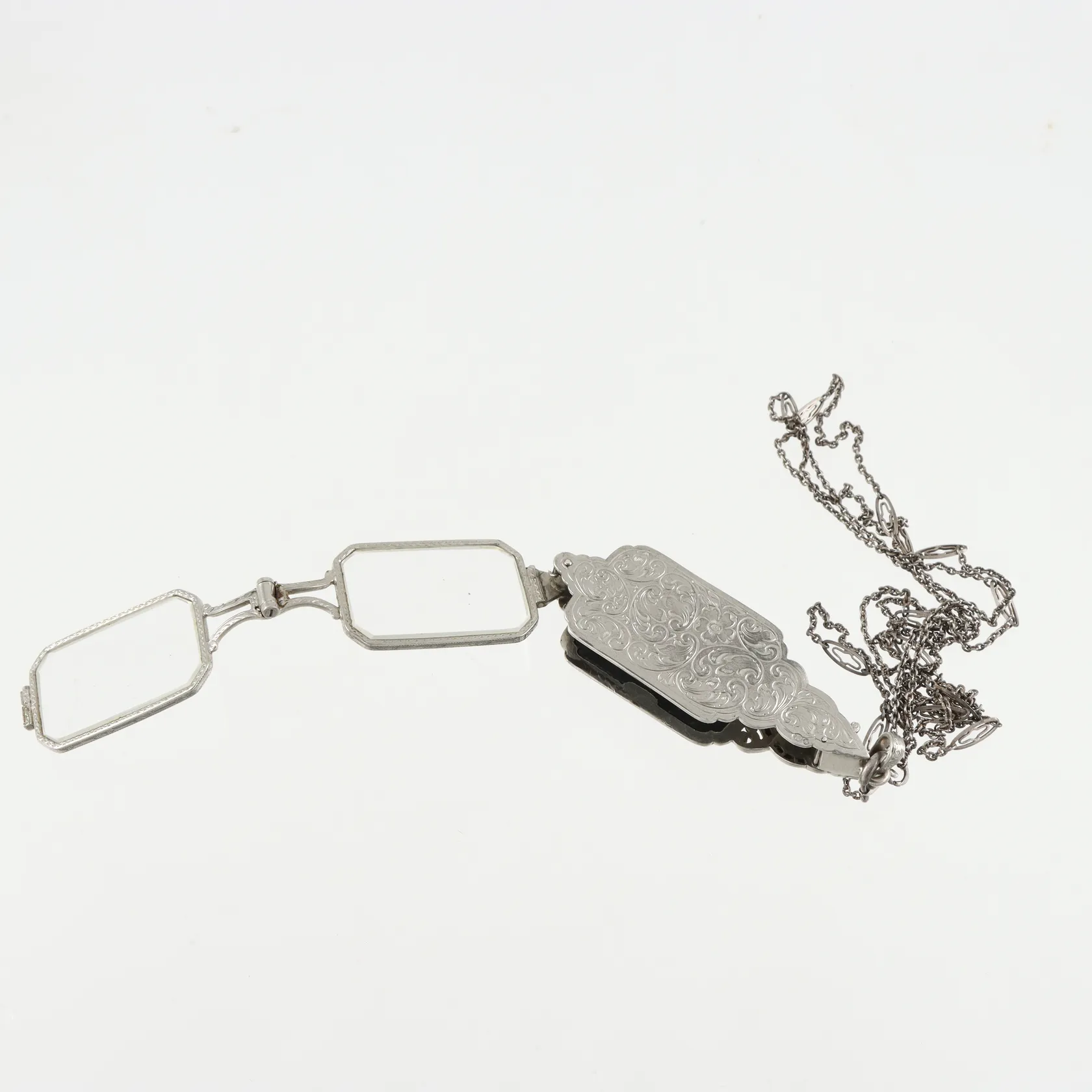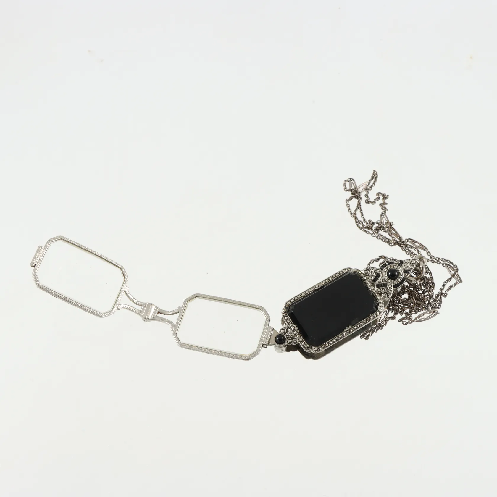 Lornjett med kedja, silver med markasiter, och onyx Art deco 1900 talets första hälft, ett glas med spricka. Vikt: 37 g.