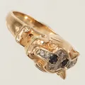 Ring panter med blå stenar, möjligen safirer och diamanter ca 13 x 0,01ct, stl 18, bredd ca 10mm, 14K Vikt: 11,3 g.