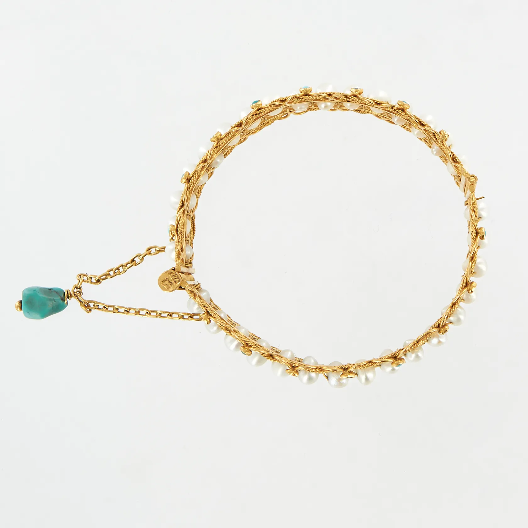 Armband stelt öppningsbart, odlade pärlor4x5mm, turkosa stenar, innermått 18cm, bredd: 9,3mm, 22K Vikt: 43,7 g.