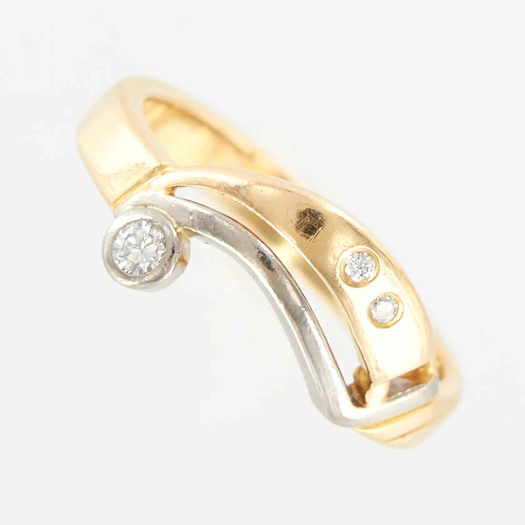 Ring, diamanter 1 x ca 0,04ct, 2 x ca 0,01ct, stl 16¾, bredd 3-9mm, vit/gulguld, 18K. Vikt: 4,4 g.