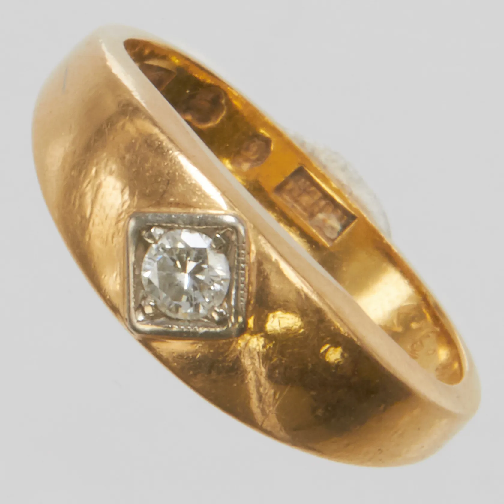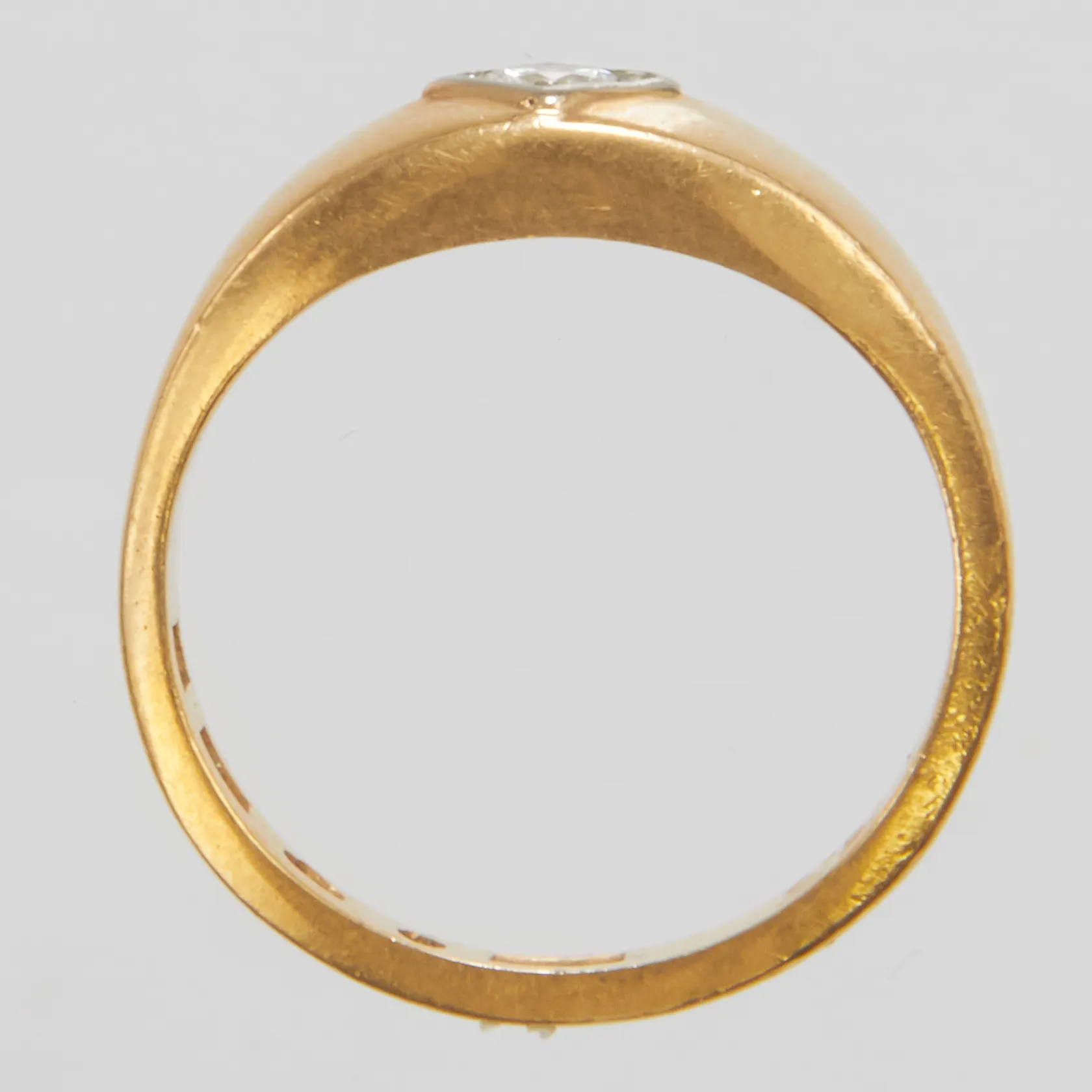 Ring briljantslipad diamant ca 0,09ct Ø17½ bredd:3-6,5mm år 1932 gravyr 20K. Vikt: 7,3 g.