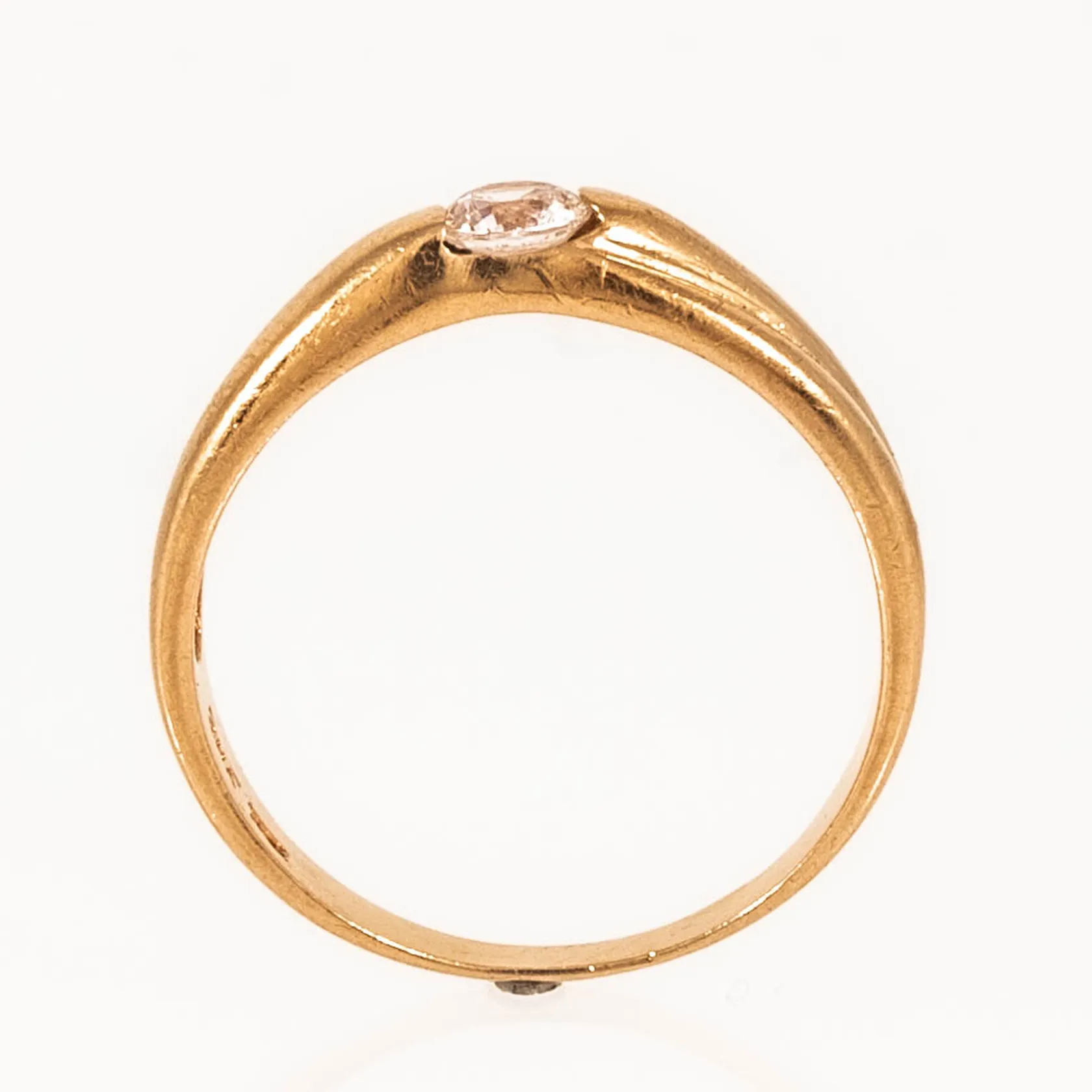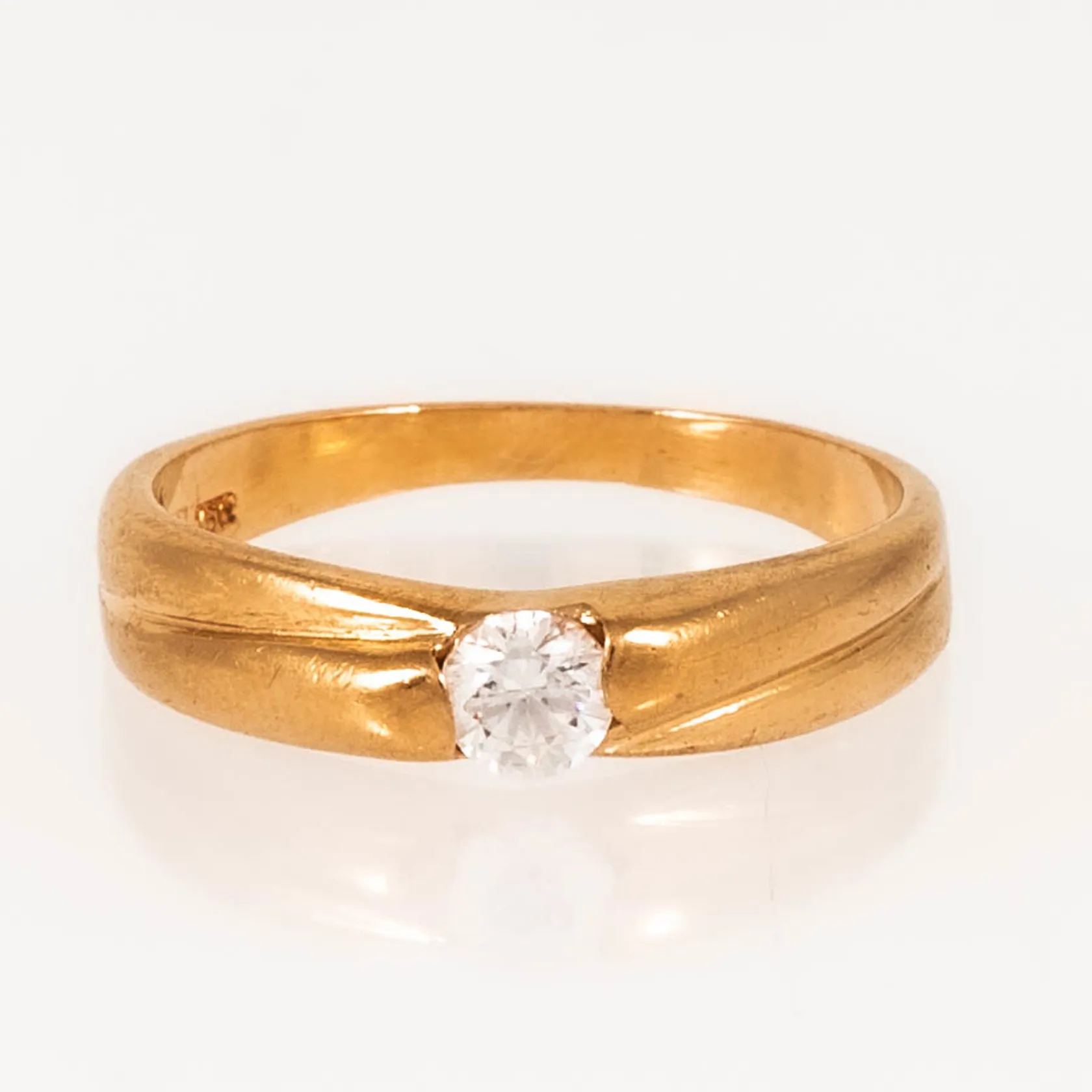 Ring i 18K guld med vit sten. Den är i storlek 17¼, är 1,9 - 4,2 mm bred och väger 3,1g. Stämplad GHA (Guldfynd), 750. Vikt: 3,1 g.