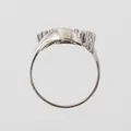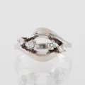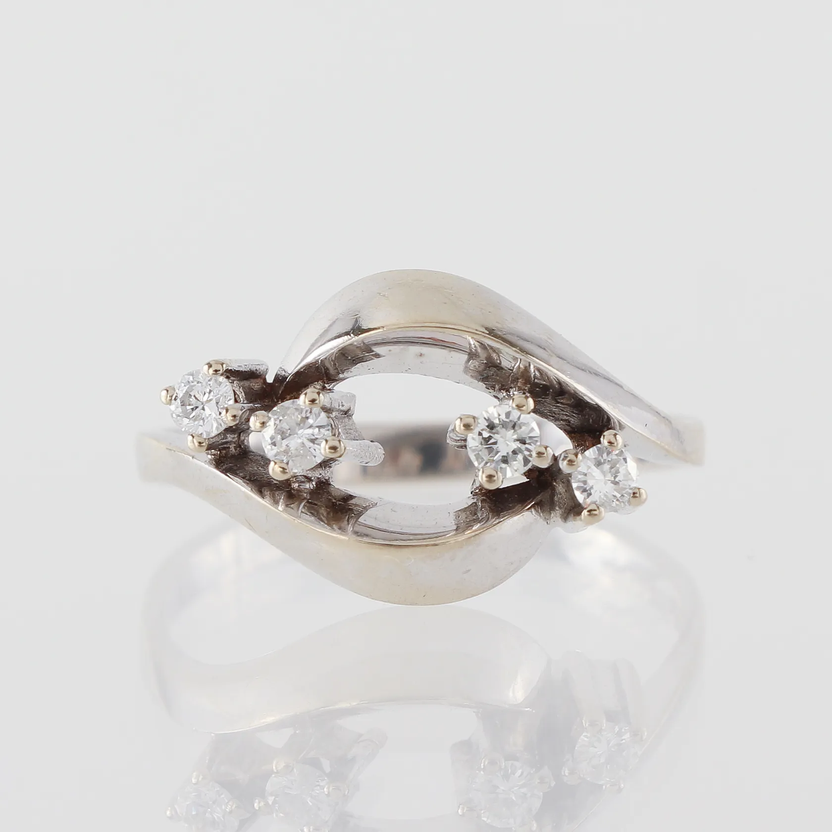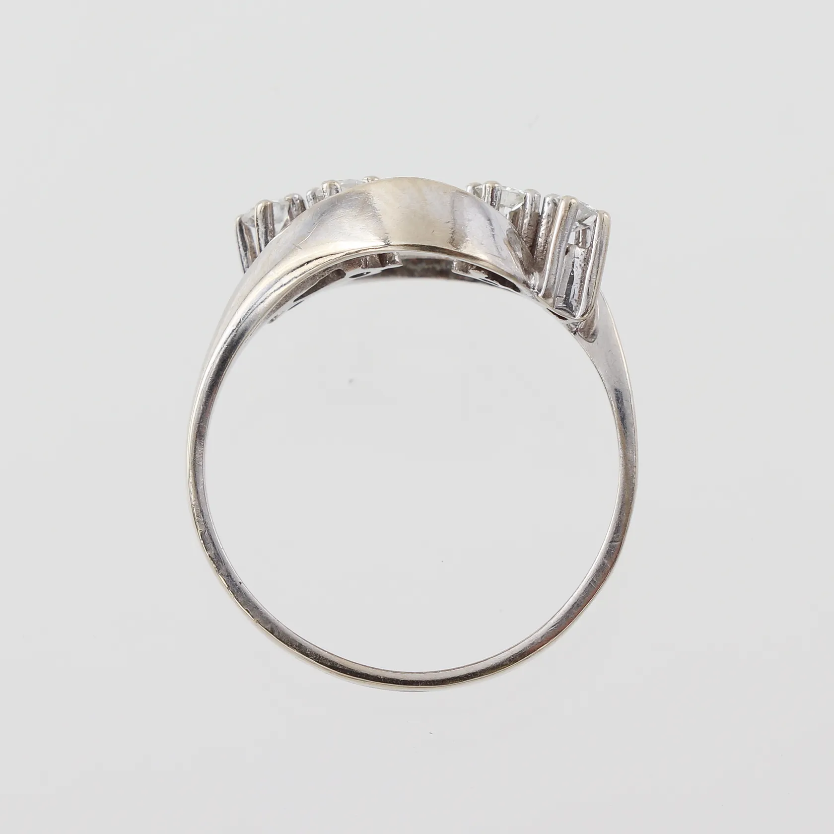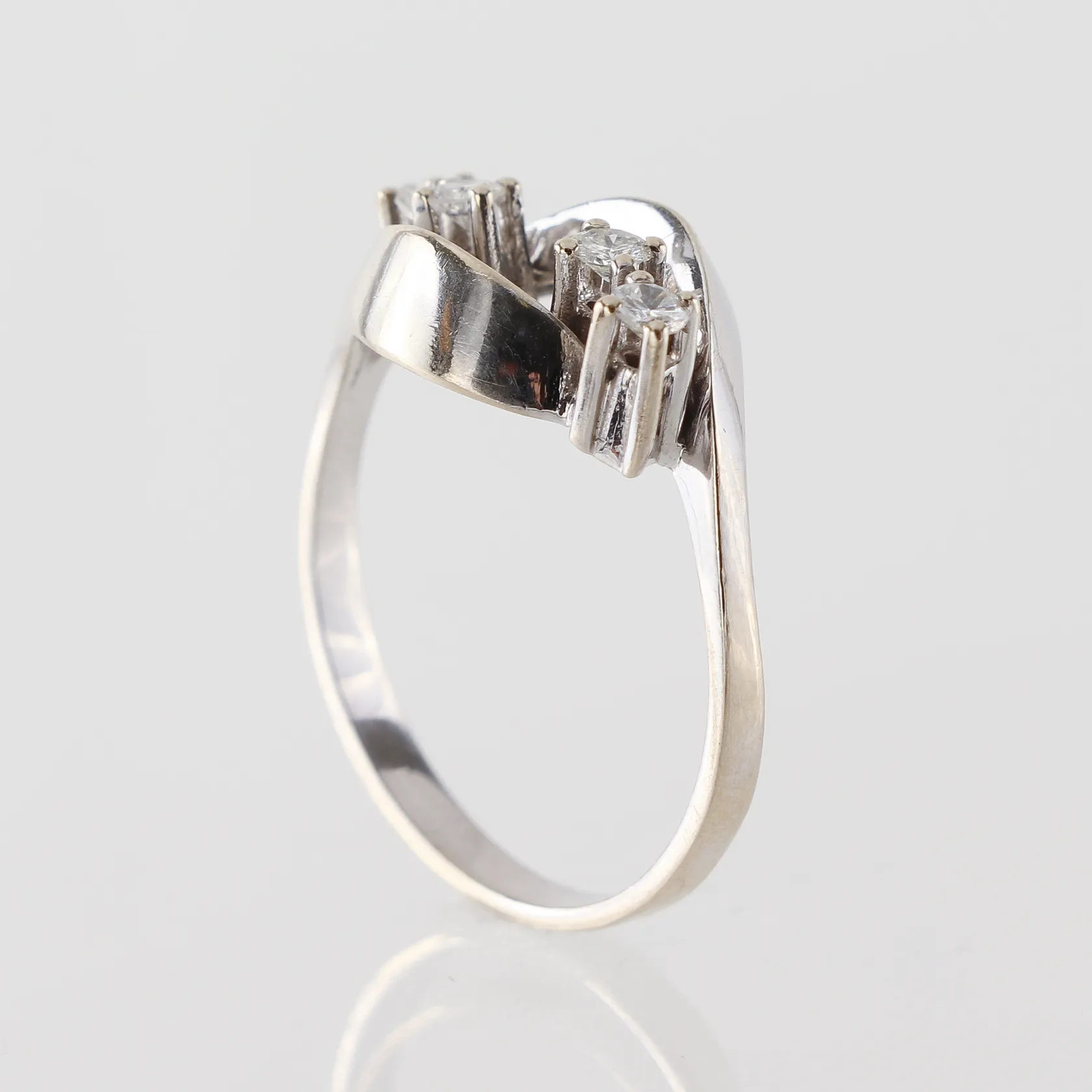 Ring med diamanter ca 4x 0,05ct , stl 17½ mm, bredd 2,1-11,1mm, 14k vitguld Vikt: 3,1 g.
