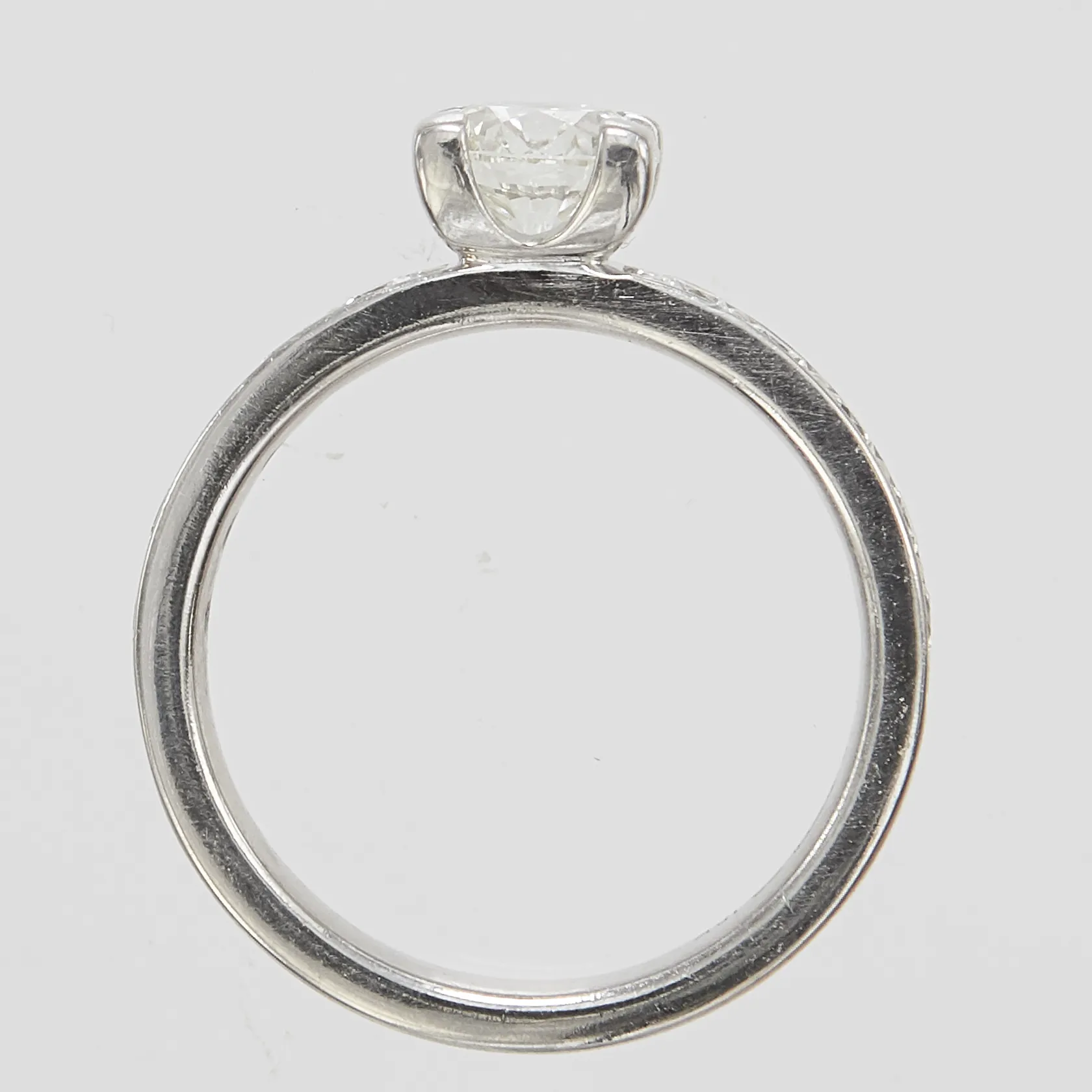 Ring med diamant 1 x 1,00ct, H/VS1, laserinskription: IGI 468192715 samt 10 diamanter 0,60ctv enligt gravyr, stl 17¼, bredd 3,4-6,2mm, Schalins, vitguld, 18K Vikt: 5,6 g.