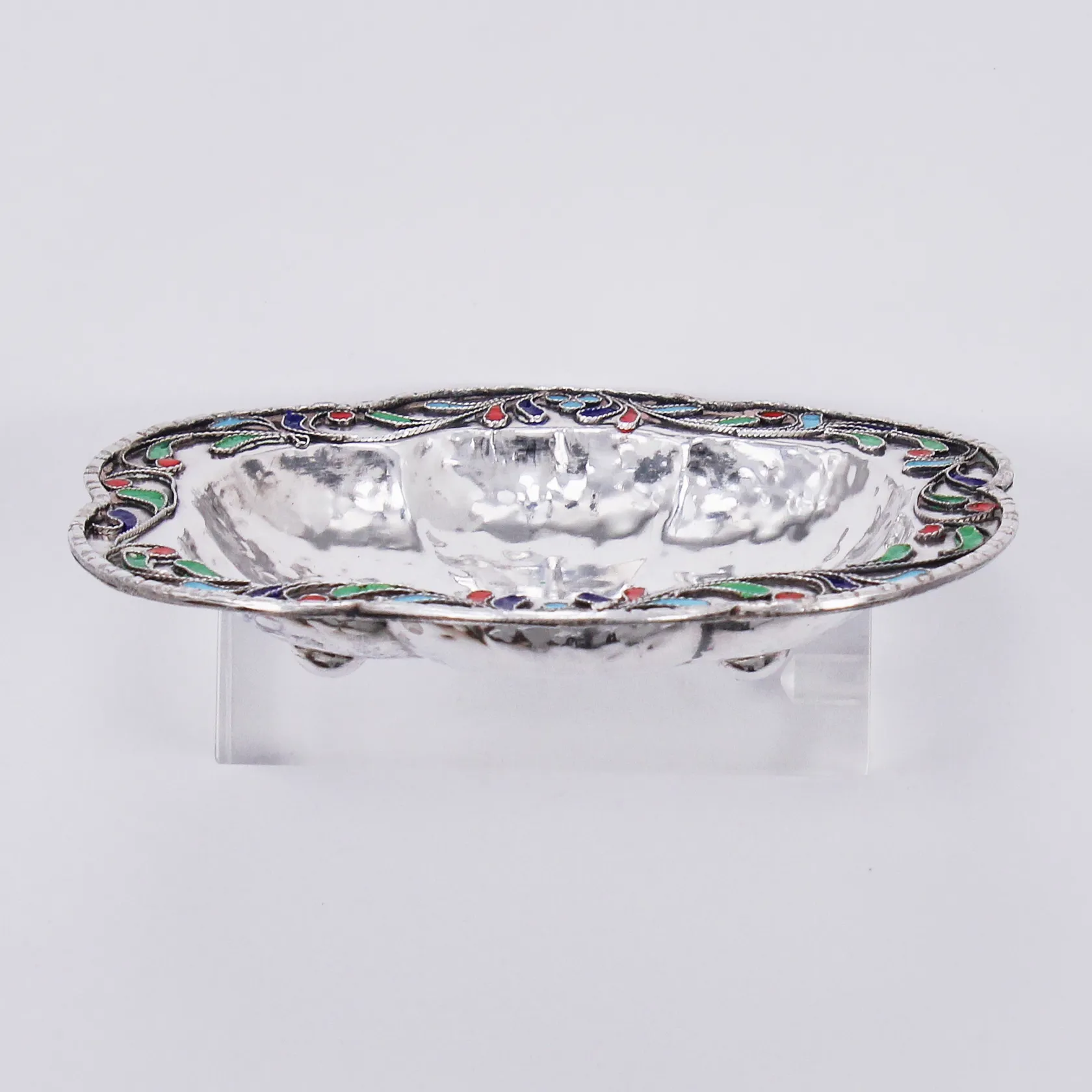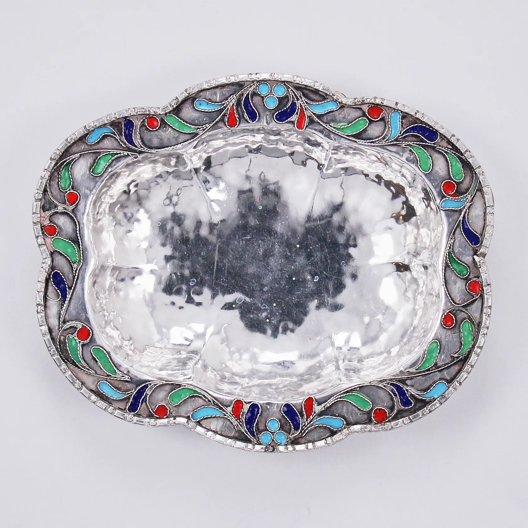Fat med färgad emalj 85x70mm, ostämplat silver Vikt: 22,7 g.