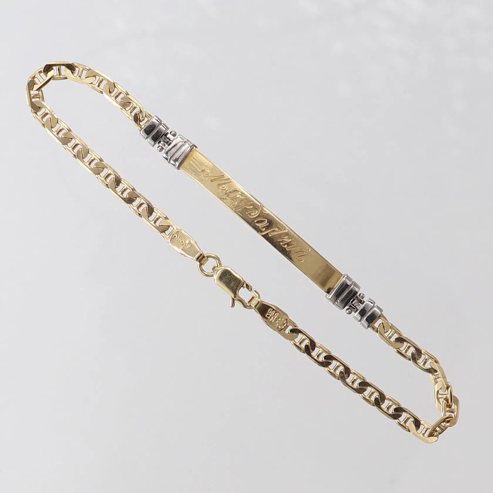 Armband med platta, längd 18,5cm, bredd 3-4mm, gravyr, tvåfärgat 14K. Vikt: 6,6 g.