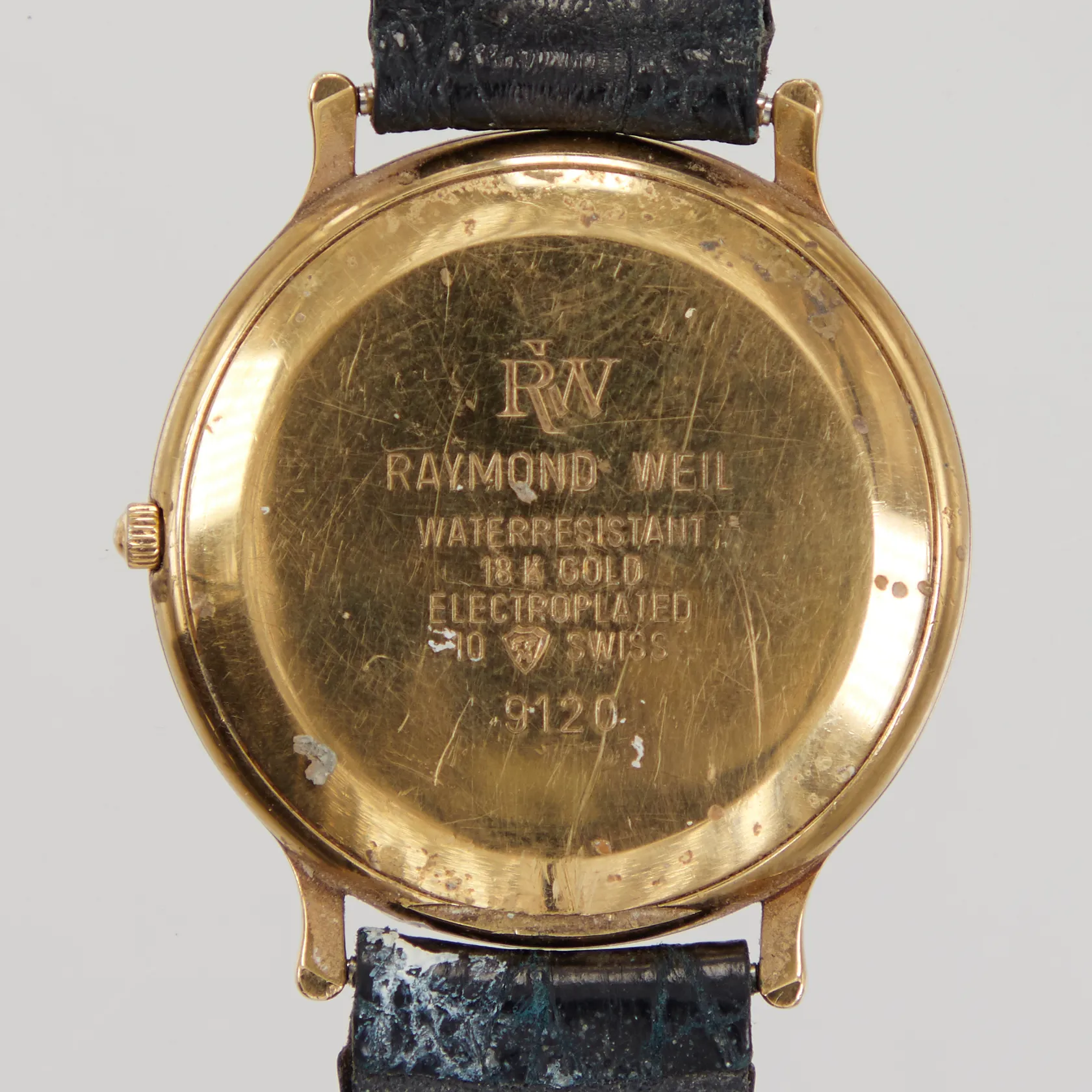 Armbandsur Raymond Weil 9120, quartz, datum, Ø 31mm, guldpläterad stål, läderband skadat/slitet