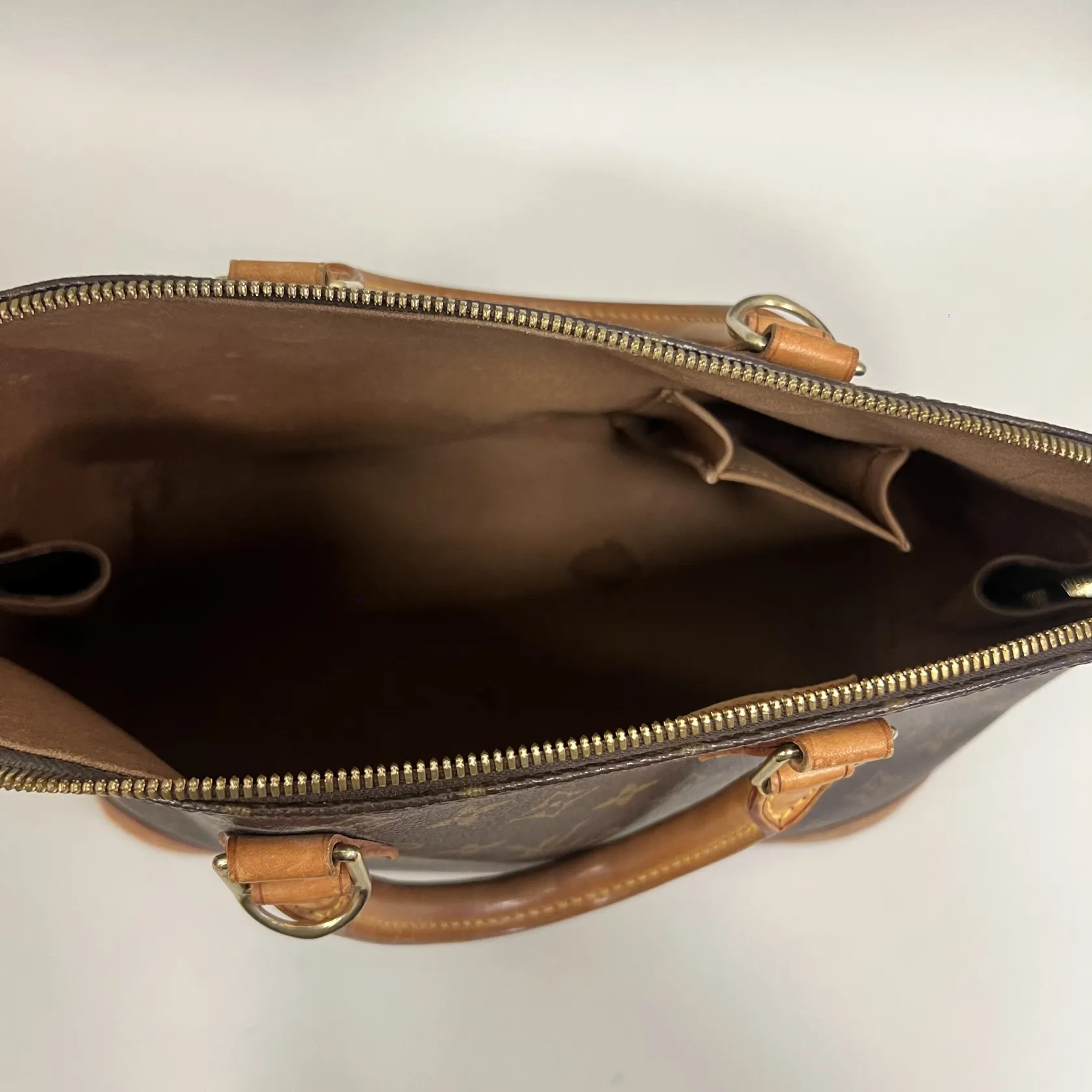 Väska Louis Vuitton Alma, monogramcanvas, datumkod BA0074, Frankrike år 2004, mått ca 32x23x16,5cm, kraftigt bruksslitage, fläckar, stark lukt/odör, inga tillbehör