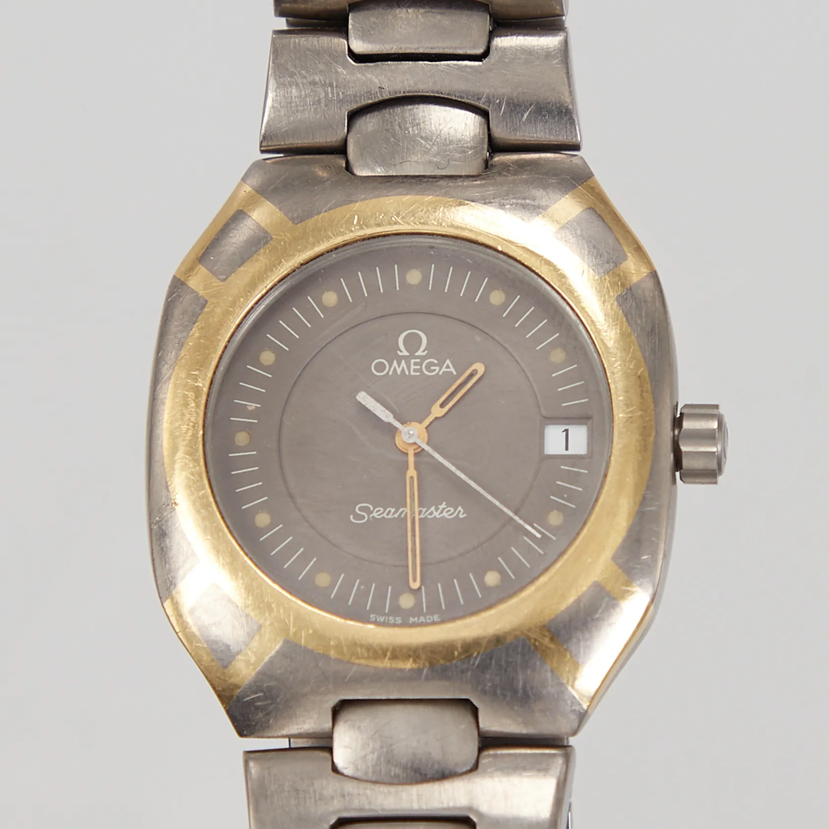 Armbandsur, Omega Seamaster Polaris, titan, kvarts, boett ca 37x32mm, länk ca 18,5cm, bruksslitage, inga tillbehör.