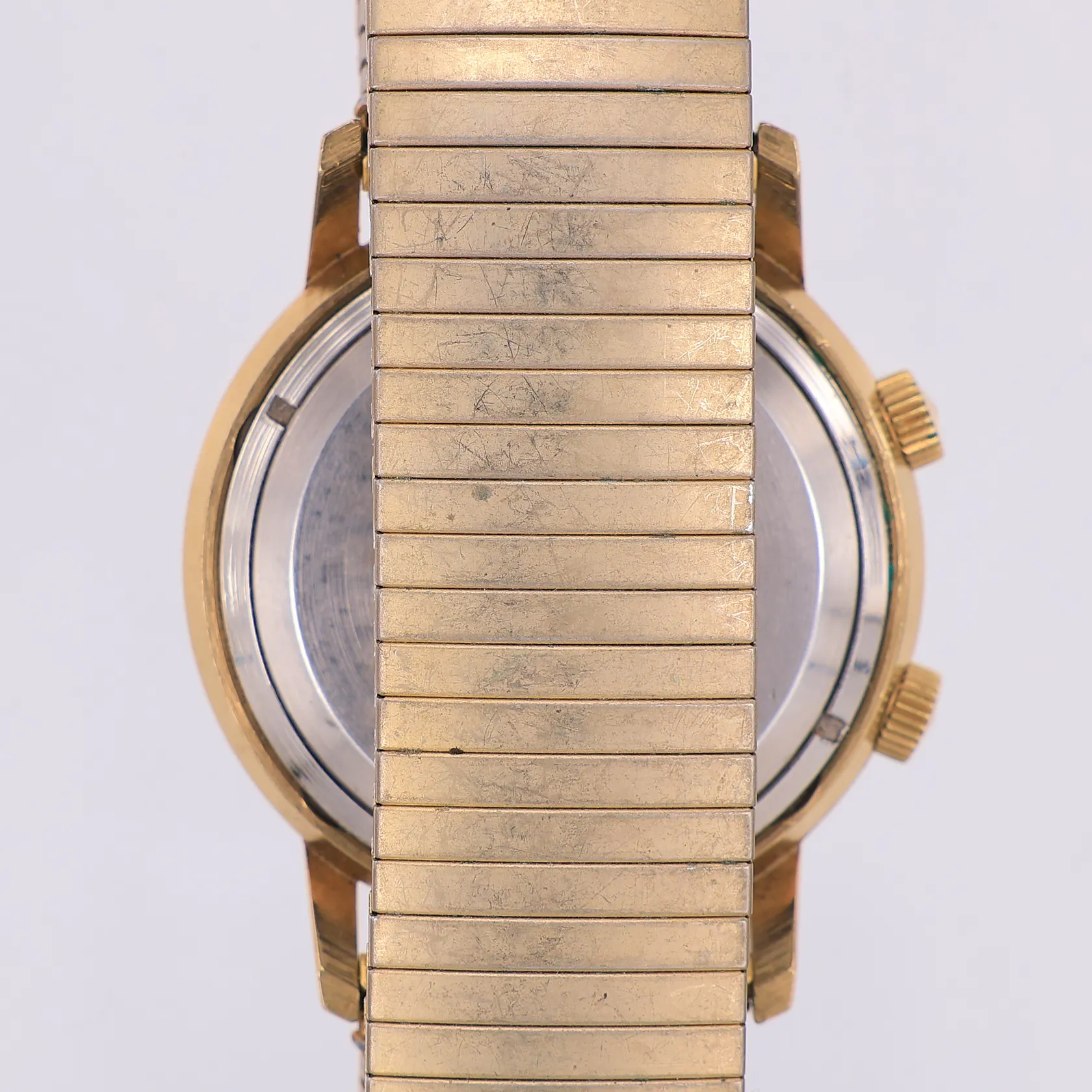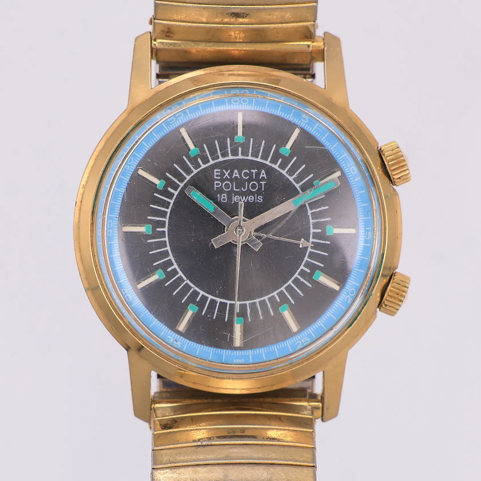 Herrur Exacta Poljot, guld på stål, manuell, Ø34mm, alarm, rysk, repigt glas, flexband
