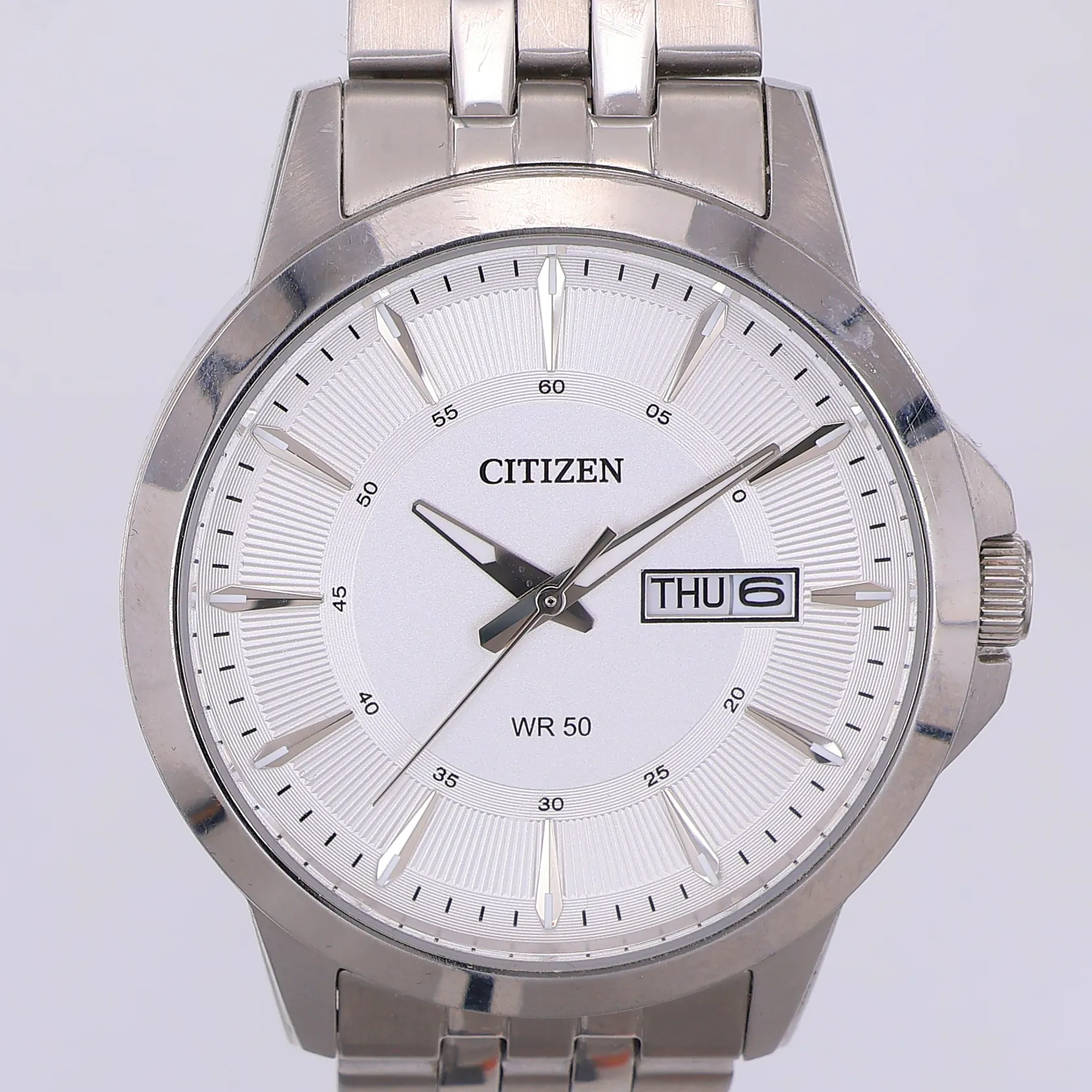 Herrur Citizen WR50, dag/datum, quartz, Ø41mm, serienr 2D2220674, Gn-4s, stål, stålband ca 18cm, står still, box