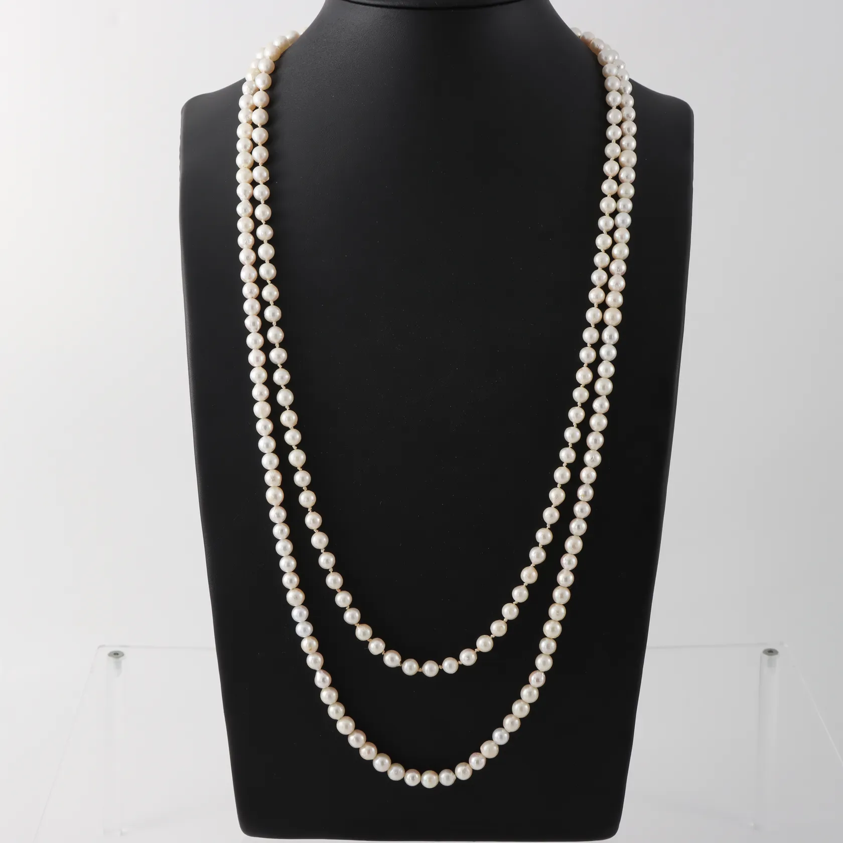Collier 2st med odlade sötvattenspärlor Ø ca 6,5-7mm, ihopsatta med ett stensmycke i metall, längd ca 86+76 cm