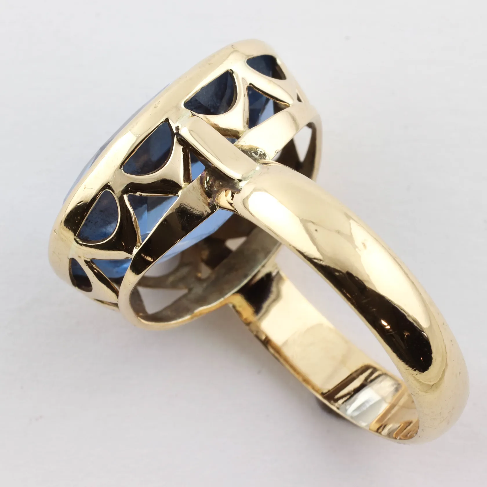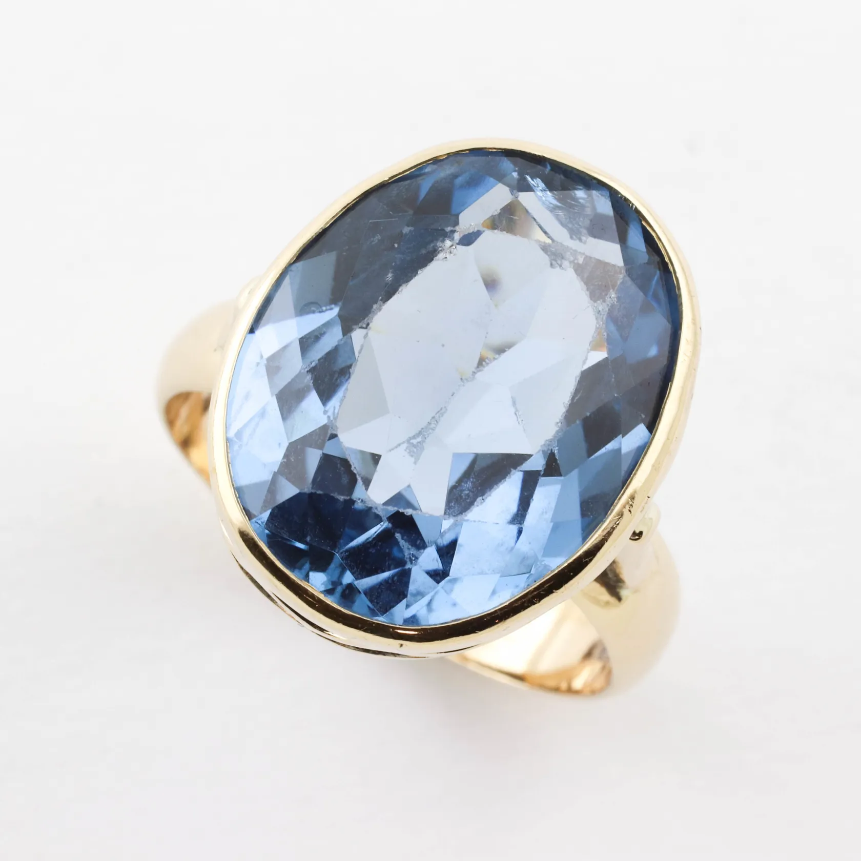 Ring med stor oval blå syntetisk spinell, stl 19 ½ mm, bredd ca 4,4-20 mm, 18K, Vikt: 10,1 g.