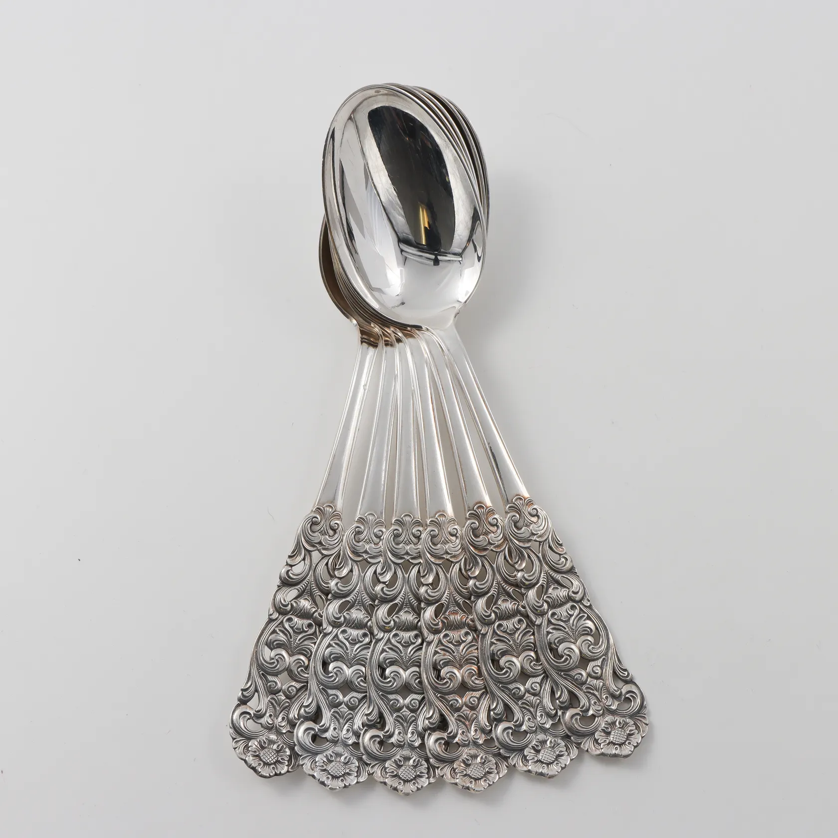 Skedar 6st, Th Marthinsen Norge modell Valdres, längd 19,2 cm, silver 830/1000 Vikt: 262,5 g.
