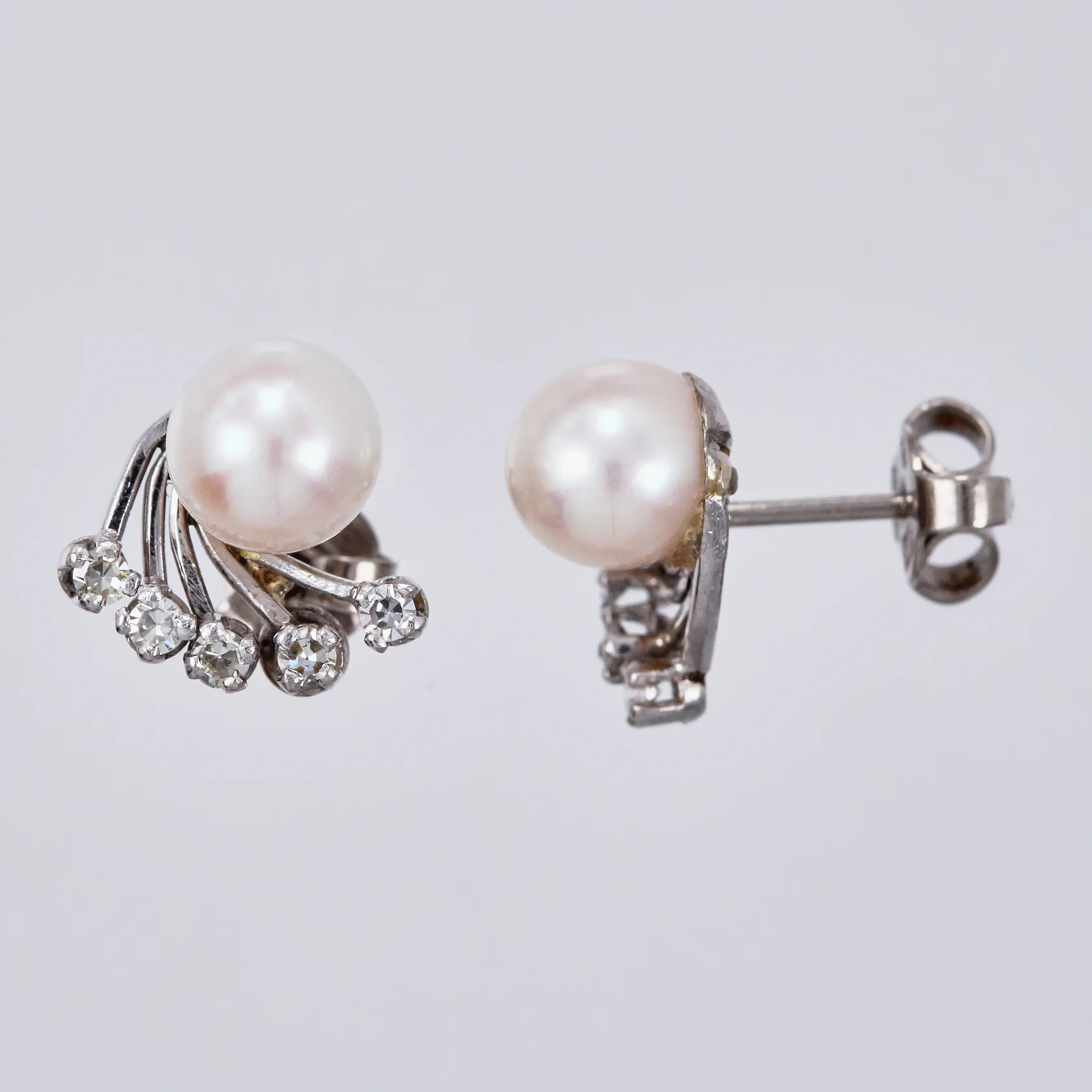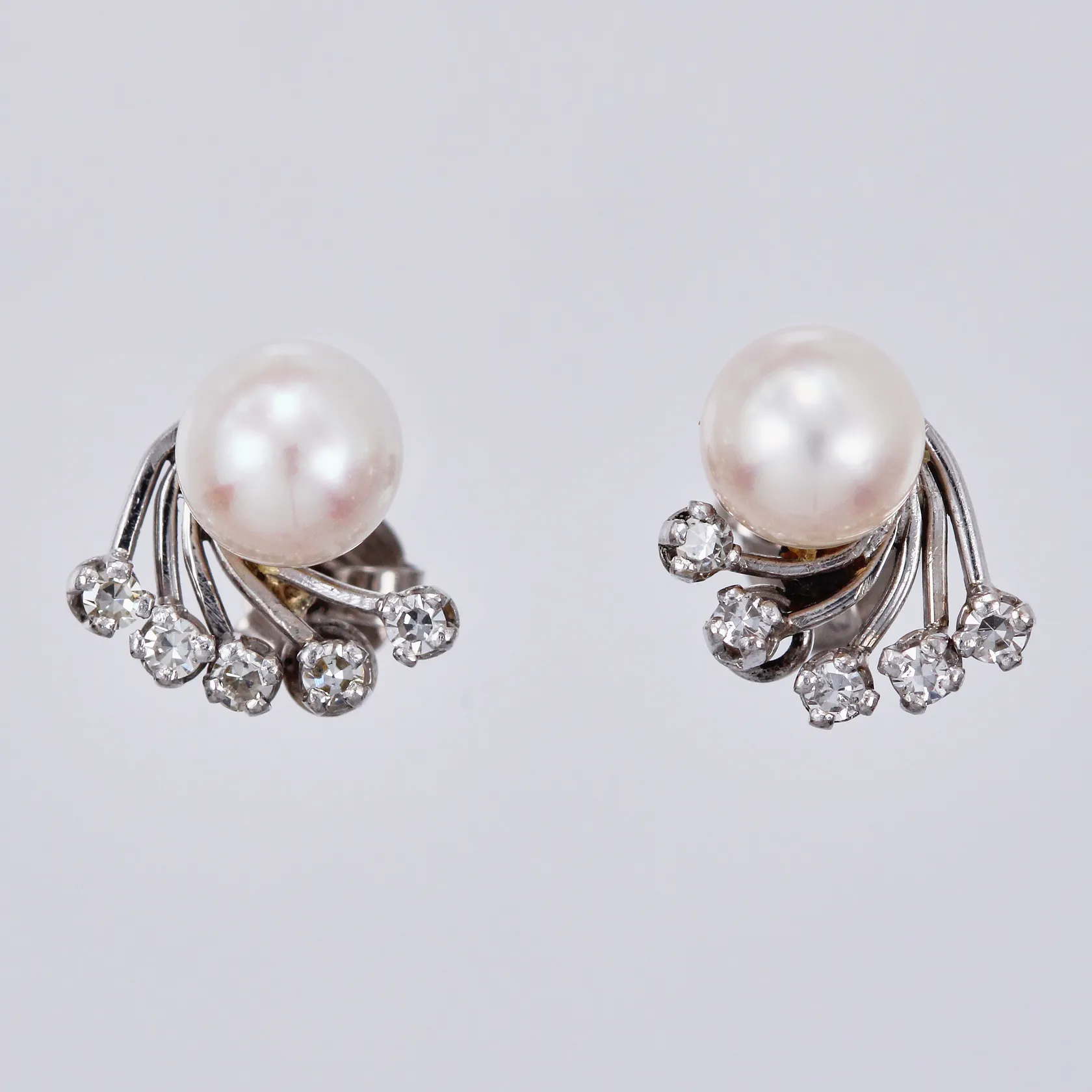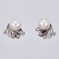 Ett par örhängen odlade pärlor Ø 6mm & diamanter ca 5x0,01ct vardera, 8/8-slipning, ca 12x10mm, 18K Vikt: 3,1 g.